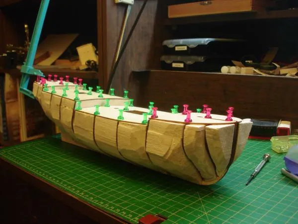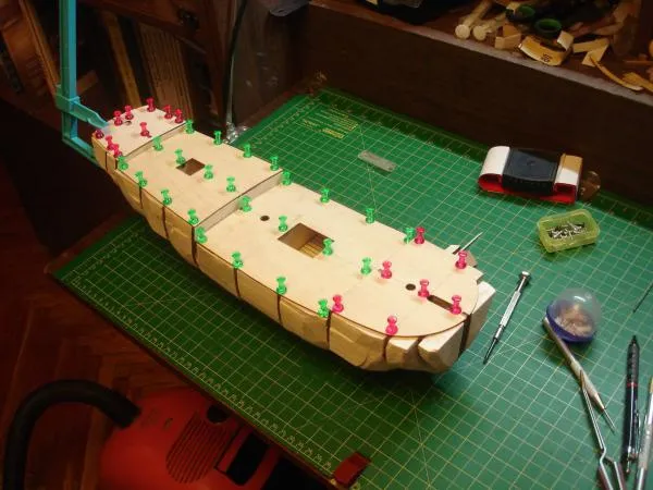 На предыдущем кораблике при заполнении корпуса, я не доводил бальзу строго до поверхности палубы, в итоге косяки скелета (или сборки) привели к тому, что палубная фанера легла с небольшими вмятинами. Косяк этот довольно сложно заметить, но его наличие всегда отравляет самооценку