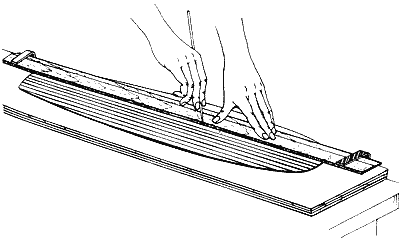 Соответствующую своим требованиям палубную разметку, моделист может выполнить сам из шпона или фанеры. Перед обрезкой палубы по размерам корпуса необходимо разметить и нанести линии острым ножом или иглой. При этом рекомендуется использовать металлическую линейку. С целью точной укладки планок настила рекомендуется использовать измеритель (микроциркуль или разметочный кронциркуль с микрометрическим винтом - прим. перев.), накалывая им в заготовке палубы маленькие отверстия. При достаточной осторожности и правильном планировании последовательности это не такая уж и трудоемкая работа. На Рис.11-2 показан метод фиксации и разметки заготовки палубы. Затемнить или просто выделить линии стыков можно ранее описанным методом. Этот метод может быть использован на любом материале, на котором можно процарапать бороздки и нанести контрастную краску.