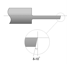 Шаг 4. Пожалуй самый главный момент изготовления фрезы - это нужный угол режущей кромки. Нужен угол 5-10 градусов (рис. 5) Более острая кромка режет плохо, т.к. плохо держит заточку. Противоположный от режущей кромки угол тоже желательно закруглить. Для тонких фрез это очень важно.