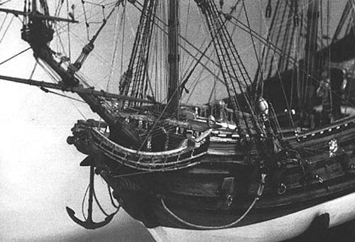 Вырезание квартер-галереи на судне семнадцатого века приводит в панику любого моделиста. Хитрость состоит в том, чтобы суметь посмотреть сквозь все блестящие резные детали и увидеть простые основные формы галерей, которые легко сделать из блоков сосны, липы и другого дерева. Кормовая квартер-галерея имела в середине изящный изгиб вверх, далее уклон и затем вновь небольшой подъем к бортам.