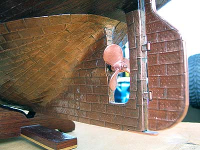 Чеканка наносилась по краям листа и вразбежку в центре. По краям получилось примерно 20 точек на 1 см и 11 в центре листов в шахматном порядке. На фото 6 и 7 можно видеть фрагменты обшивки носовой и кормовой части корпуса. Точки старался ставить на участок нахлеста соседних листов. Иначе случалось, что немного отходили по клеевому шву уголки листов (иногда) или происходили проколы медных листов (чаще). Приподнявшиеся участки правил подшипником, прокатывая его вдоль приподнявшихся кромок.