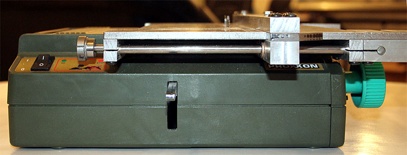 Куда более критичным мне казалось то, что штатный стол короткий - длинную реечку 2х2 мм довольно проблематично резать - гнется. Поэтому свой стол сделал максимально длинным.