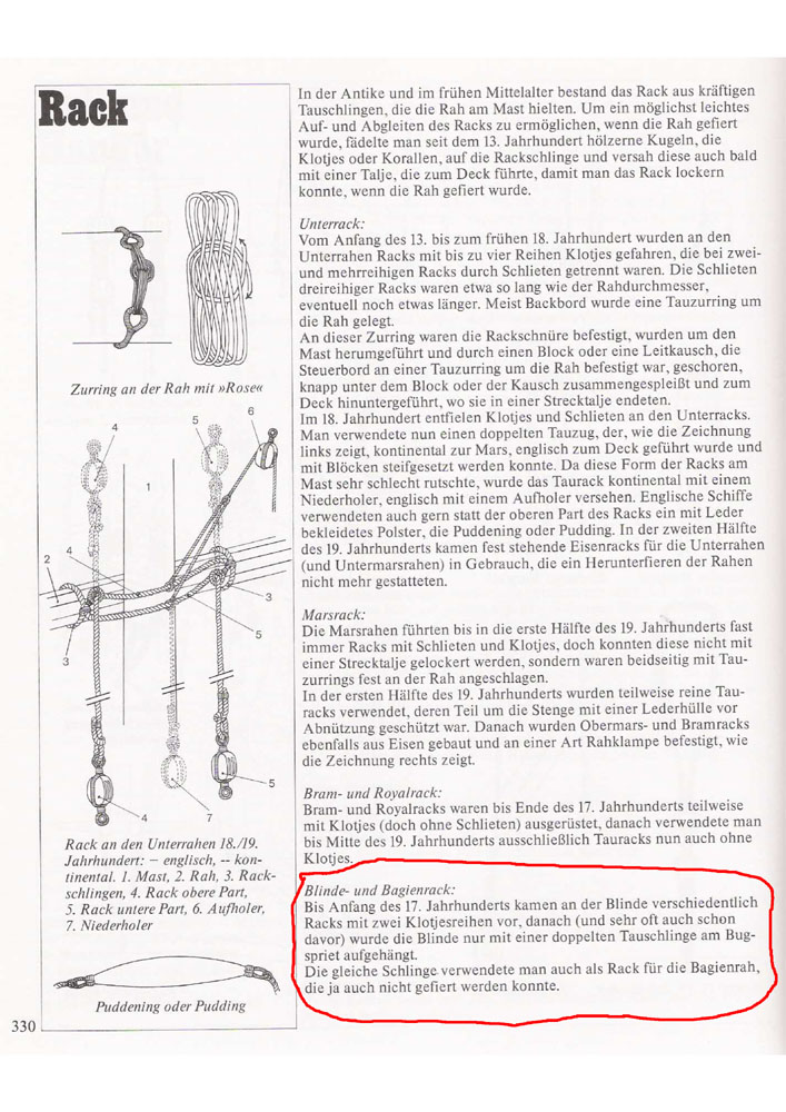 вопрос же мой каксательно такелажа галеона конца16-начала17 века узконаправленный,в данном конкретном случае- если смотреть на гравюры современников(ниже,фрагменты иллюстраций из книг Bjorna Landstrom и Peter Kirsch),то насколько я понимаю изображенное, блинда -рей подвешен к бушприту не на слинге,... на одной из гравюр правда хорошо виден ракс бугель,но опять же ,на остальных гравюрах и на паре совр.реконструкций-видно что рей соединяется с бушпритом посредством талей...как по Вашему мнению конструктивно должен быть исполнен такой узел, свою версию я приводил выше по ветке?