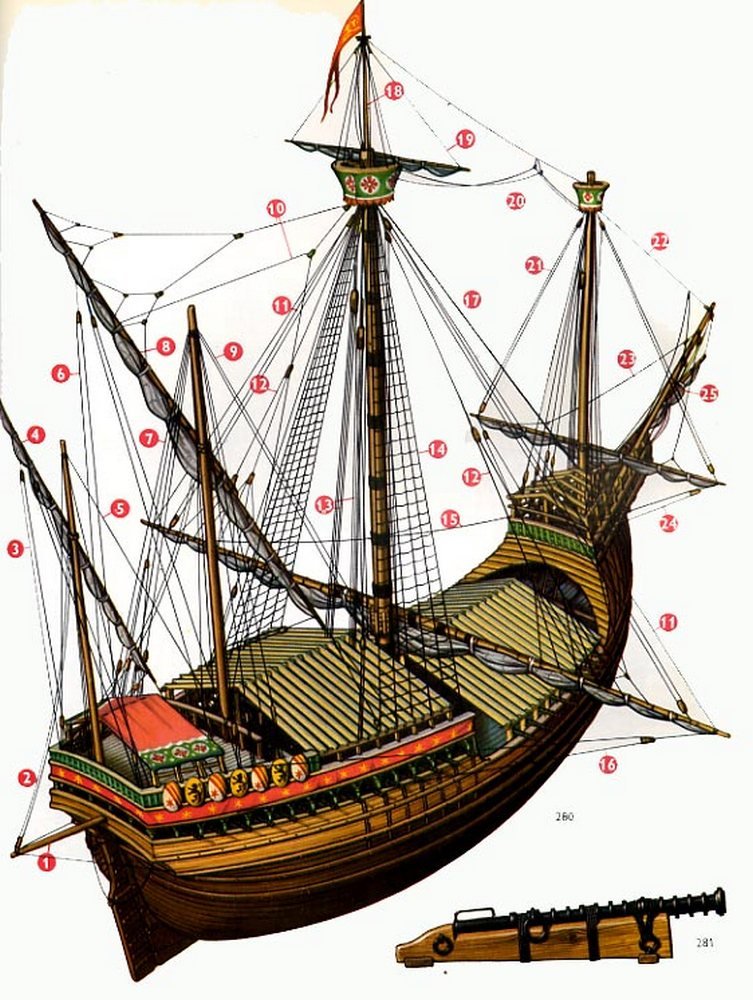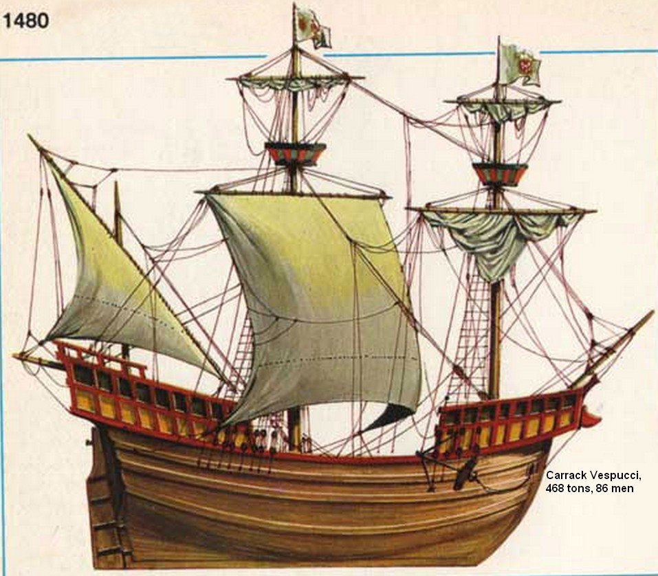 В 1520 г. португальский военный флот включил в свой состав эту огромную боевую каракку. Парусник изображен на картине, хранящейся ныне в Национальном военно-морском музее в Гринвиче. Каракка имела две мачты с прямым парусным вооружением: высокую грот-мачту в центре и фок-мачту спереди, почти у самого форштевня. Имеется также и вторая мачта с латинским парусным вооружением, именовавшаяся «бонавентура», равно как и марсель на фок-мачте. Кормовая надстройка, занимавшая пространство от грот-мачты до кормы, имеет три уровня: квартердек, полуют и кормовой мостик. Баковая надстройка значительно выдвинута вперед за пределы носовой палубы и имеет две расположенные друг над другом артиллерийские батареи. Из-за своей численности и высокого расположения над палубой орудия квартердека и полубака не имели больших калибров. В сущности, это были крупные мушкеты и мелкие пушки, установленные на планшире. Только посреди судна на палубе находились лафетные орудия, стрелявшие ядрами солидного веса. Корма закругленная, квартердек над ней плоский и имеет пушечные порты, и соответственно, пушки, чтобы вести огонь назад. Отметим также, чтов бортах нет пушечных портов поскольку на палубе располагалась всего одна батарея орудий, которые стреляли через проемы в ограждении. Известно, что на судне находилось сто сорок орудий, но мы не знаем, как они подразделялись по типам. Приблизительные размеры судна: длина 124,5-131 фут (38-40 м), ширина по палубе 39-46 футов (12-14 м), высота главной палубы 18-19,5 фута (5,5-6 м), осадка 13-14,5 фута (4-4,5 м).