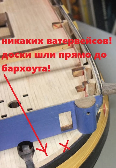 Продолжим исправлять ошибки модели Амати. Теперь займёмся носовой частью. Рассмотрим палубу и переборку бикхеда. Бикхед - это в данном случае небольшая полукруглая в плане палуба гальюна (иногда бикхедом так же называют и сам гальюн). Она возвышается над опердеком, имеет погибь, но не имеет седловатости - то есть, она не параллельна опердеку, а параллельна ватерлинии. Здесь всё в порядке в нашей модели. Спереди палубный настил бикхеда ложится на гасписы, защищая их поперечные срезы от воды. Упираются доски в бархоут. Иногда моделисты врезают палубные доски бикхеда в некий ватервейс, лежащий на гасписах, по аналогии, как это сделано на корабле-музее Виктори, однако, музейные модели 74х-пушечников опровергают этот вариант. Михаил палубный настил бикхеда выполнил правильно (см. первые сообщения в этой ветке). Так что не тратьте свои драгоценные время, силы и нервы на изготовление ватервейса на палубе гальюна.