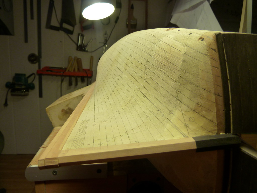 Начинаю разметку обшивки. От того как будет она выполнена во многом зависит внешний вид модели. Я придумал довольно простой способ разметки. Начало традиционное - разметка геолиний. Зона бархоутов состоящая из 4 поясов была размечена еще на стадии изготовления чернового корпуса,c помощью шаблона. За базу для разметки взял нижнюю линию бархоута. На полоске тонкого картона сделал ножом насечки через расстояние равное ширине доски на миделе. Первую геолинию решил провести примерно посередине на границе 12 го и 13 пояса, в месте носового потеряя. На миделе с помощью шаблона сделал метку по 12 му поясу, на штевнях положение этой линии снял с чертежа. Далее приколол по этим трем точкам тонкую рейку и постарался придать ей плавность по всей длине корпуса. Не должно быть перегибов при взгляде с любого ракурса. После выравнивания приколол её кнопками и обвел карандашом. Вторая линия будет на границе 2 го и 3 го пояса от киля. Это связано с нестандартной её шириной в районе кормового дейдвуда из за потеряя. Теперь я получил два участка из 12 и 11 поясов. Собственно осталось разделить их на соответствующее количество частей. Делается это с помощью того же шаблона полоски. При заужении полоска ставится наискосок, что автоматически дает меньший размер. Когда угол полоски становится слишком большим делаю еще одну поменьше и продолжаю ей. Накалываю полоски с помощью микростамески 2 мм. Осталось все наколотые метки соединить с помощью короткой линейки или просто рейки. Получившаяся немного ломаная линия позволяет оценить плавность всего пояса. При наклейке обшивки ориентиром все равно будет не линия а засечки.