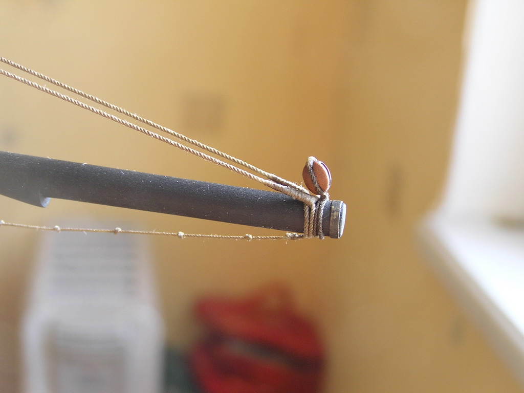 Нет, конечно не сплесниваю, все равно этого не видно будет. Тут два варианта. Можно сначала сделать огон и следом за ним вплести блок или сначала сделать строп нужной длины и потом вставить в него блок и поставить бензель.В любом случае имитация сплесня делается одинаково. В первом случае это делается прямо на блоке, во втором на круглой палочке подходящего диаметра. Сначала делается полуузел, место проклеивается циакрином. Потом концы обрезаются. Если строп оклетневан, то диаметр скрутки примерно равен диаметру клетневанного троса. Тут важно расчитать длину клетневки, в месте завязывания полуузла её быть не должно. На мелких блоках, 4 и менее мм я строп не клетнюю, слишком толсто получается.