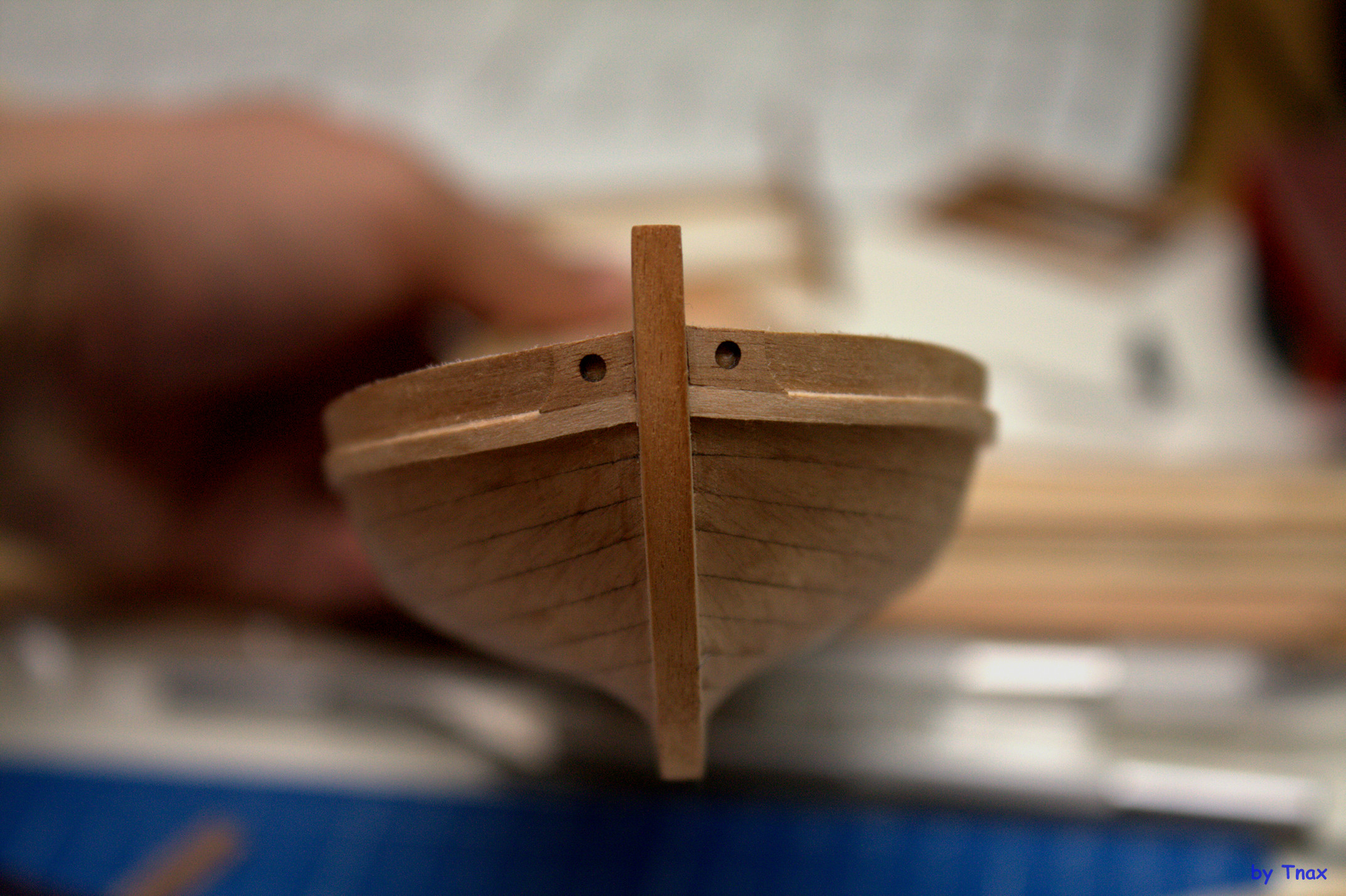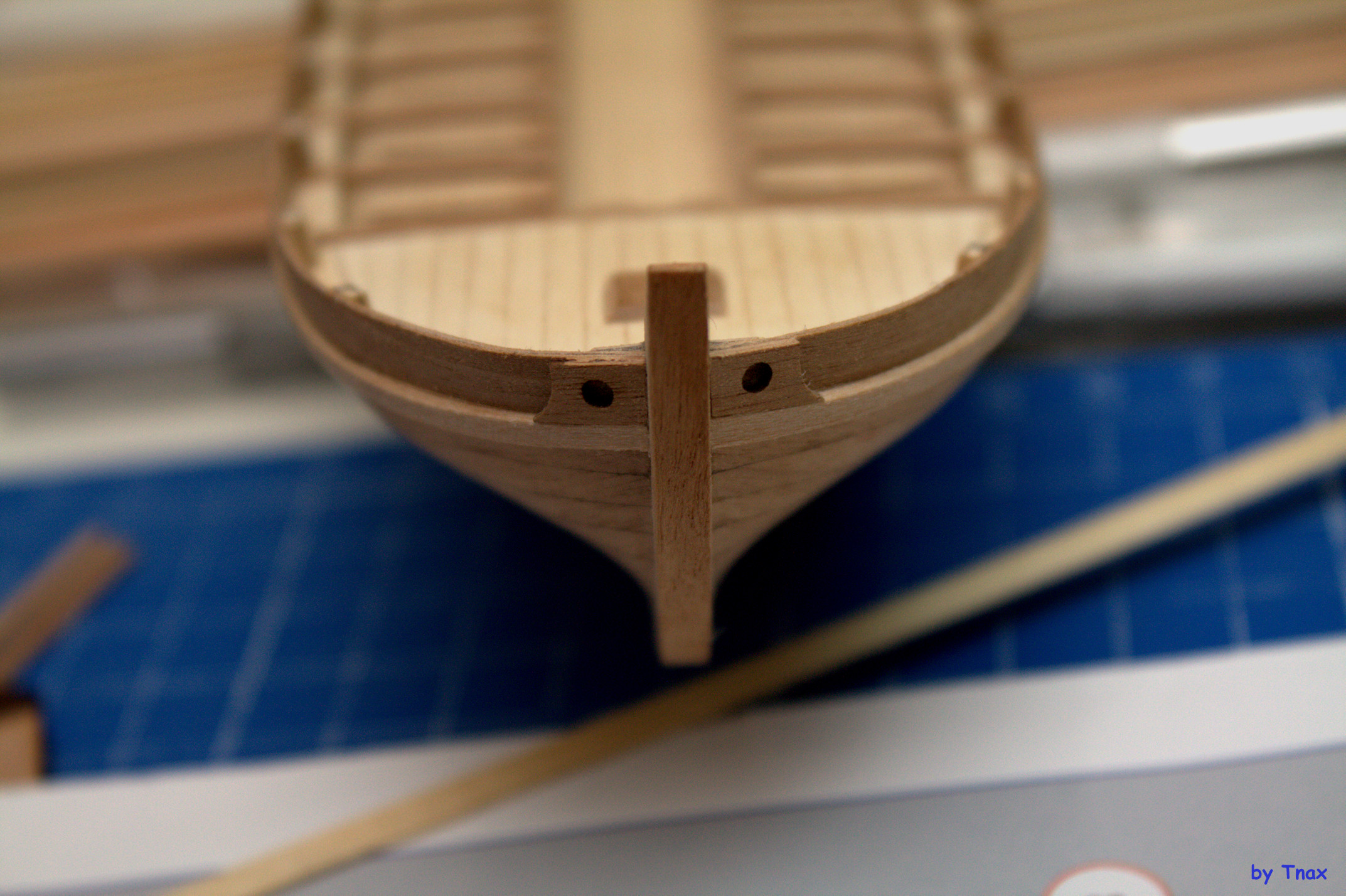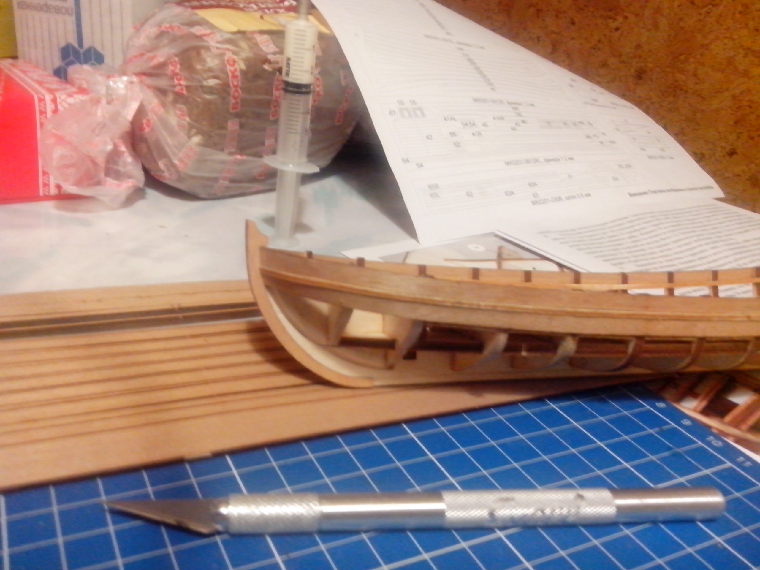 - почти всё из шпона - клеенное из двух слоёв, как следствие нужно внимательно планировать что и как клеить в местах, где потенциально будет много шлифовки (последняя рейка у киля, часть реек у кормы). Можно перестараться и получить лохмотья клея. Потому все выборки нужно делать с внутренней части.