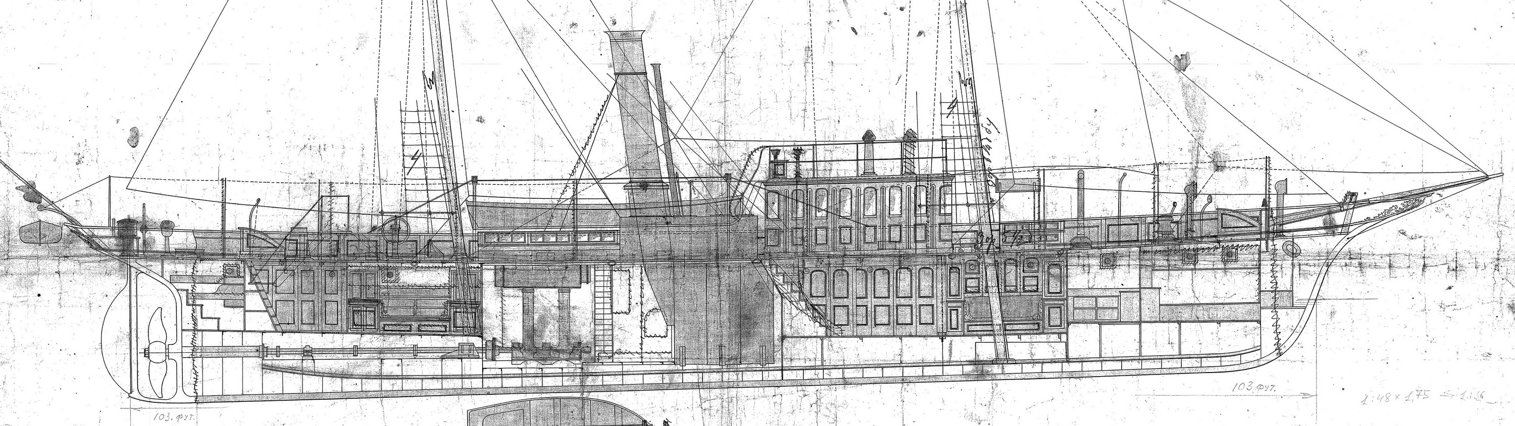Вот фрагмент чертежа Славянки (РГА ВМФ) чем могут быть не большие прямоульники между мачтой и надстройкой? Один, который на уровне ватервейса, скорее всего штормовой лацпорт. А второй, чуть выше, это что? И такой же начерчен между 3 и 4-м окном надстройки на том же уровне. Что бы это могло быть? Я уже сломал голову - нет вариантов