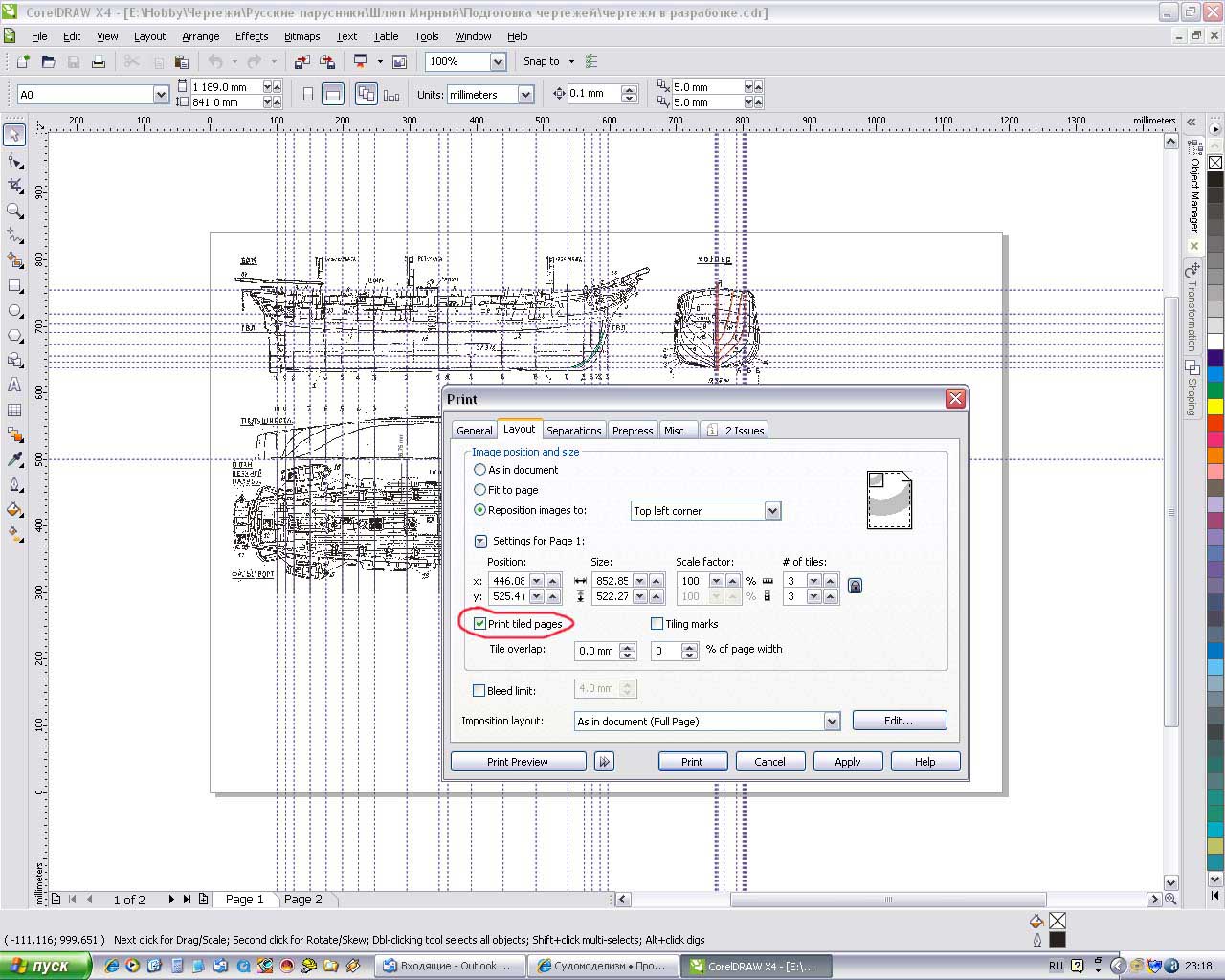 Легко. Даете команду на печать, затем в свойствах печати на второй закладке Layout ставите птичку на пункте Print tiled pages. Предварительно просматриваете. Результат просмотра на второй картинке. Можно просто отдать команду на печать и принтер напечатает все листы, а можно на любом листе щелкнуть правой клавишей и выбрать пункт контекстного меню Print This Sheet Now - напечатается выбранный лист.---(CORSAR)--- писал(а):А не подскажите,как имено через corel можно поделить?