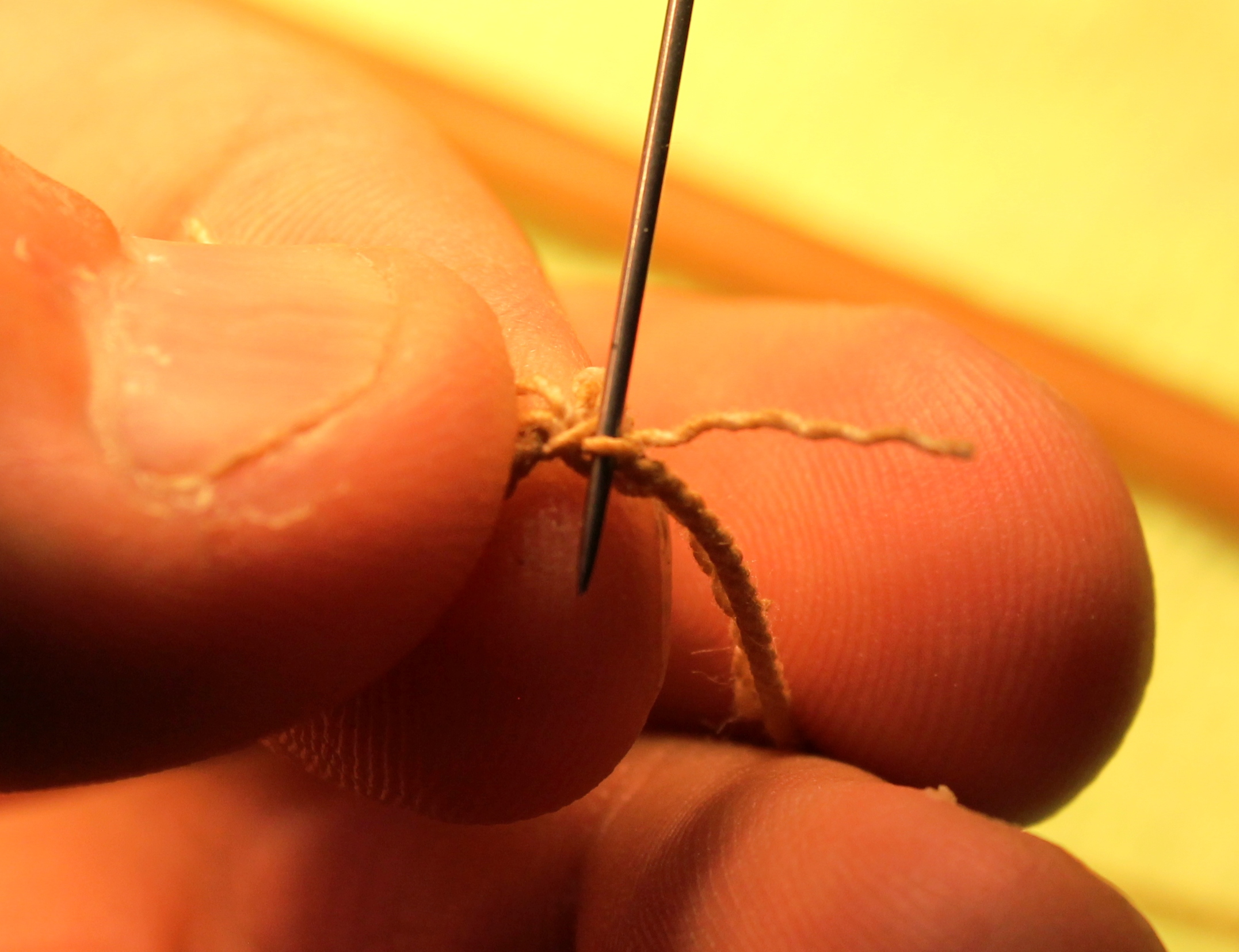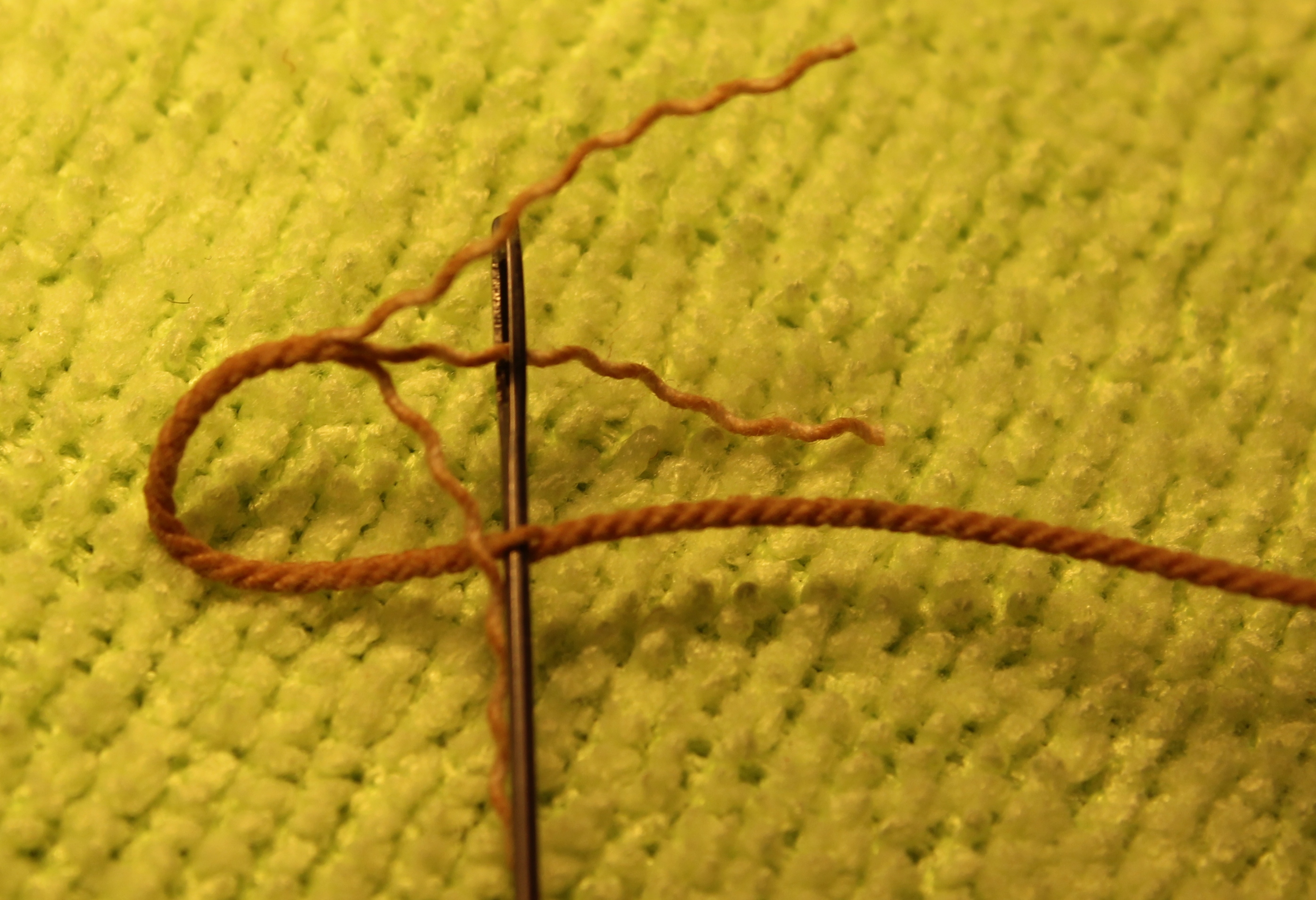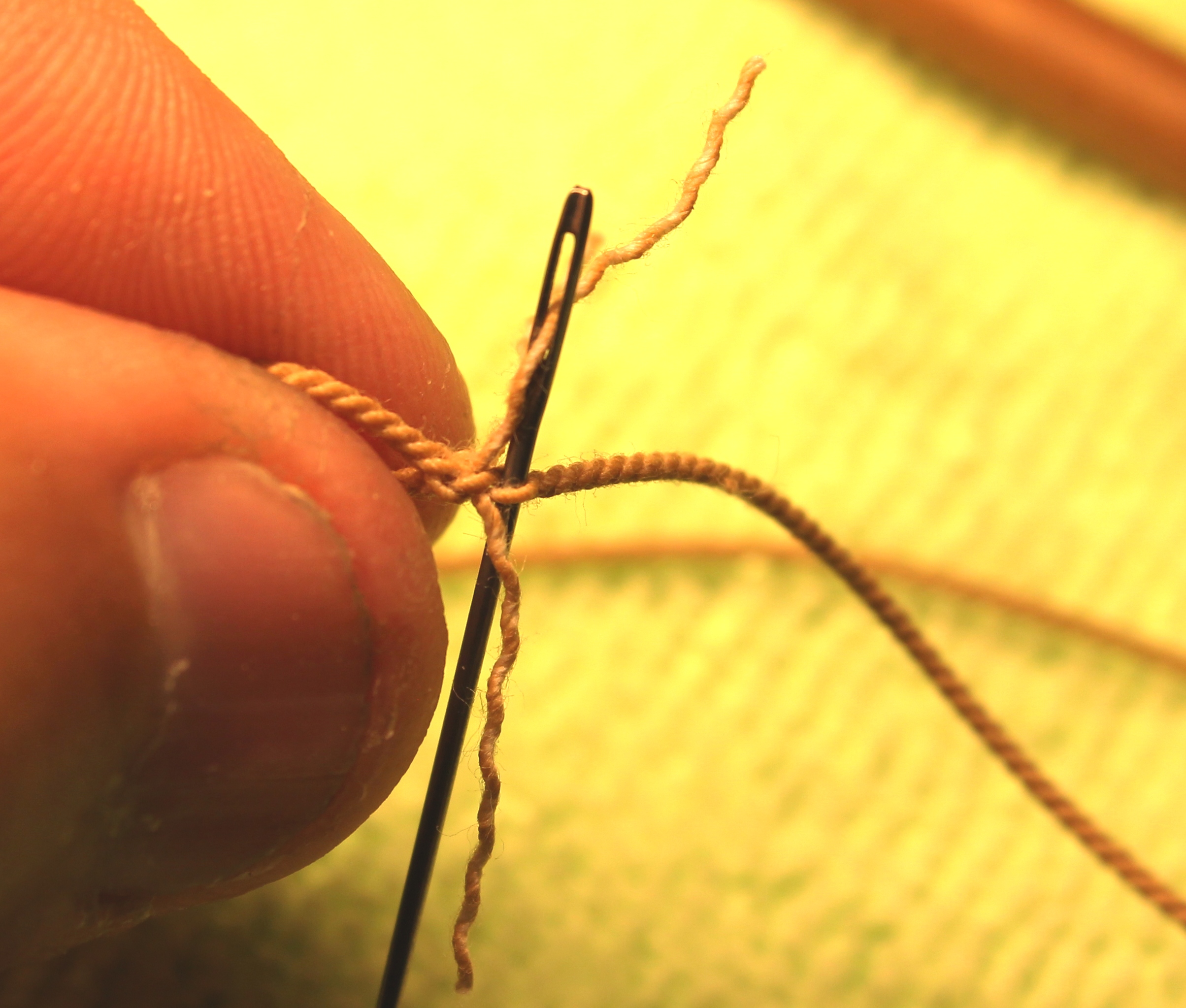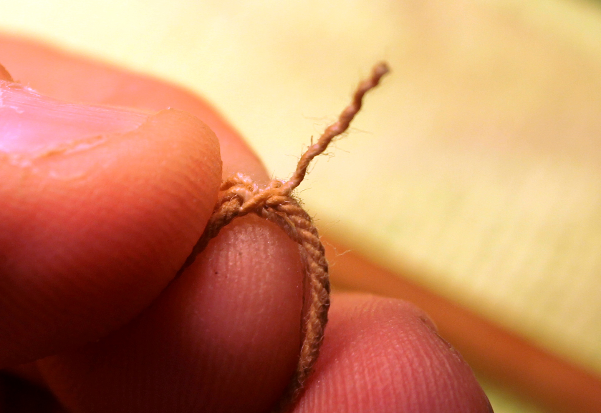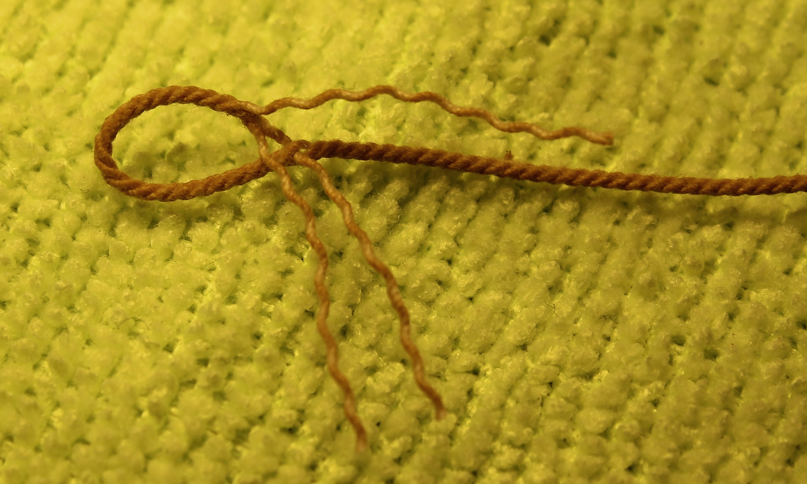 вот здесь и пригодилась оставленная петелька, чтобы игла вышла над первой прядью, а не под ней или не проткнула ее. В принципе следить за тем, чтобы не проткнуть какой-либо из хвостов лучше всегда.