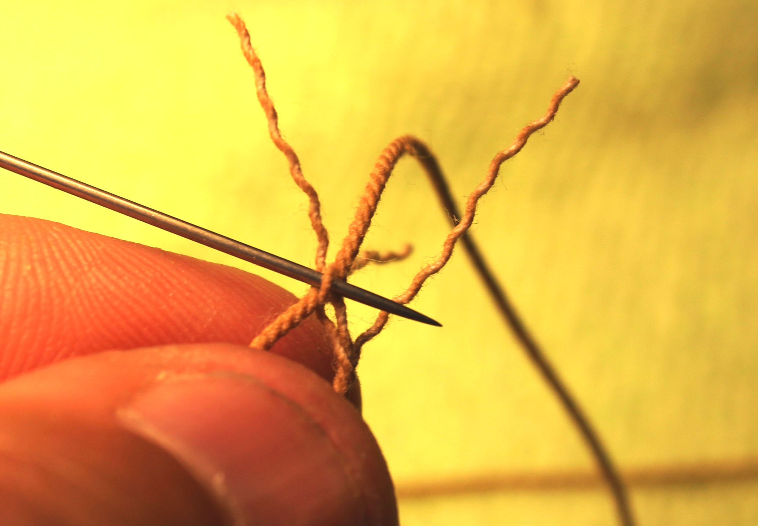 иглу под третью прядь (в данном случае та, что осталась слева) пробиваем под прядь в том месте, где у нас вышла предыдущая. Игла идет к огону, а не от него