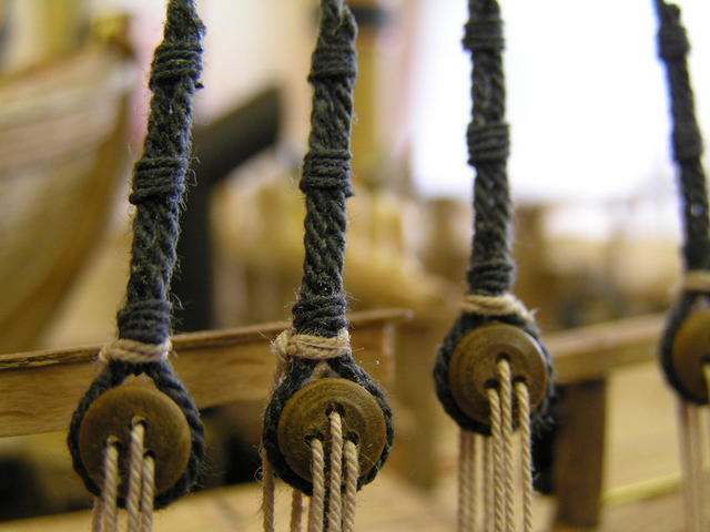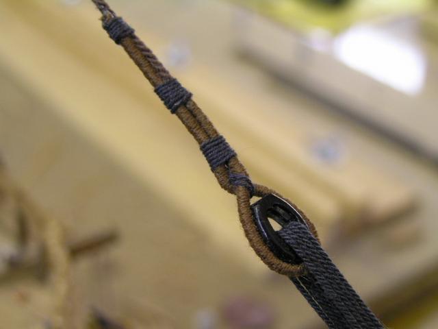 В снасти стоячего такелажа ввязываются различные блоки, которые через рымы крепятся к неподвижным частям. Какого диаметра должна быть нить которая обвязывает блок к рыму относительно диаметра основной снасти,например штага. По идее такого же но для штагов диаметр нити значительно больше ширины прорези на блоке.