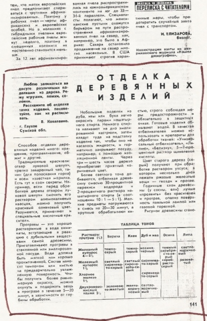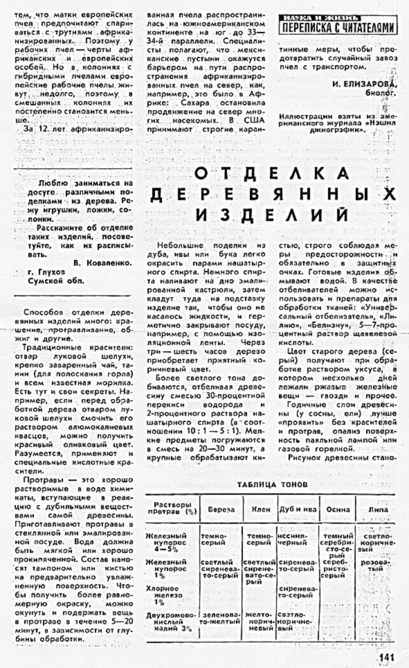 Нет ребята! Не совсем так! Этот процесс,который вы обсуждаете называется протрава. Для каждой породы древесины,свой состав химикатов.Например,что бы древесина дуба приобрела иссиня черный цвет,нужно обработать ее 3-5% р-ром железного купороса.Но для других пород,Для получения черного цвета нужен уже другой р-р. Сейчас я не нашел,но где то у меня в архиве есть таблица,какой р-р для какой породы подходит.