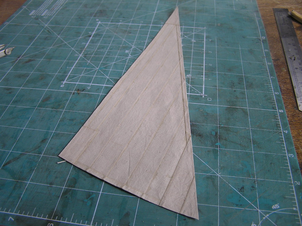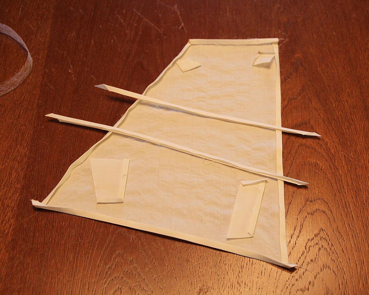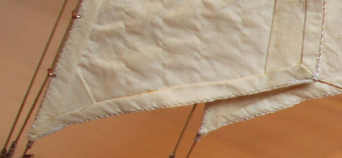 На размещенных мною фотографиях виден парус до склейки и после. Чуть ниже еще один парус после склейки элементов. Швы между полотнищами имитировал продергиванием нити через определенный интервал.