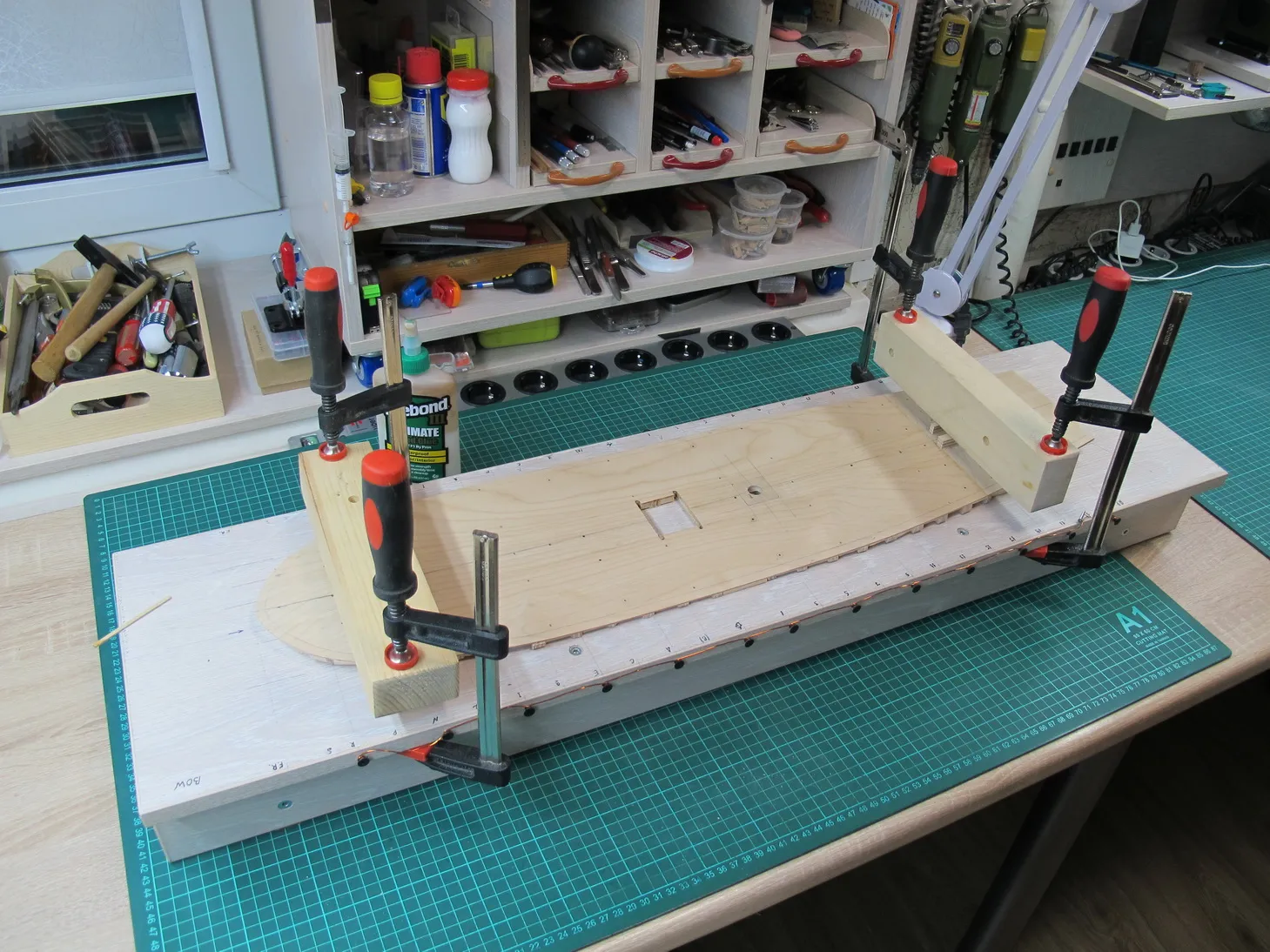 Ну и наконец водружаем палубу на стапель и фиксируем саморезами. Нужно отметить, что в средней части, где толщина этого горизонтального бутерброда составляет порядка пяти миллиметров, конструкция пока что очень непрочная, так что перемещать ее довольно таки боязно. Стапель тот же, что использовался при наборе одной из половинок корпуса. Бонусом идет уже готовая разметка линий шпангоутов, которая актуальна и для черновой палубы.