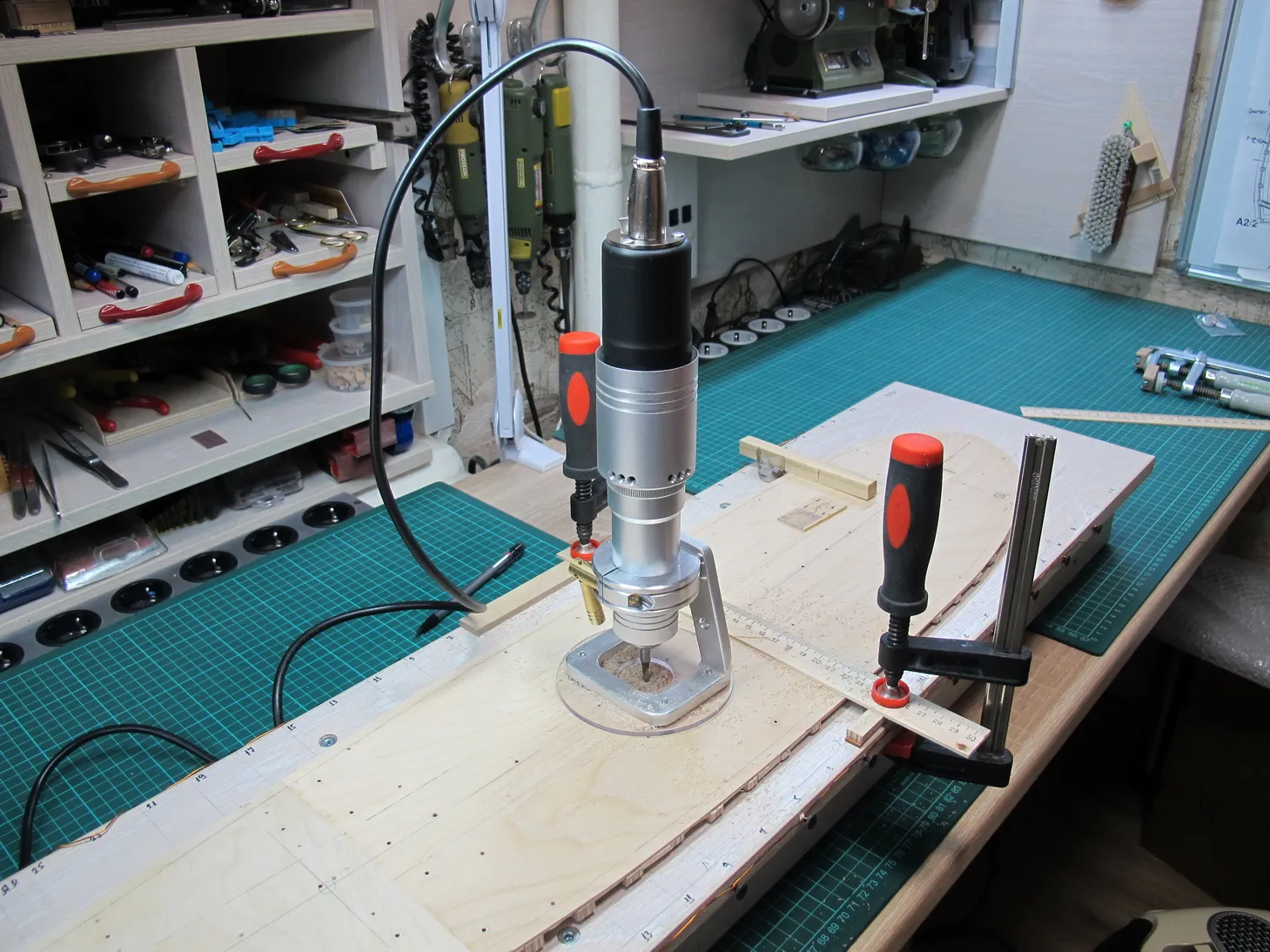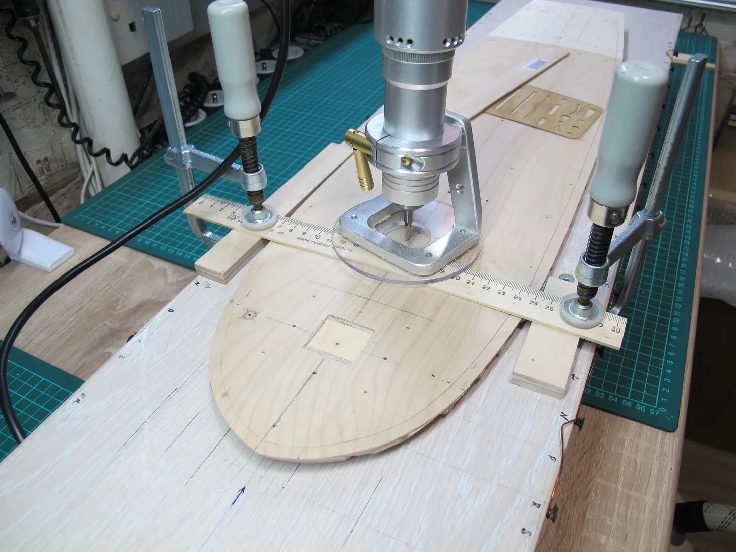 Дальше нужно подготовить посадочные места под сверление отверстий для мачт. Для этого нужно сделать в местах посадки выборки на глубину слоя фанеры. Тут в очередной раз пригодился мой Профиль, к которому приобрел за трюндель кромочную базу. Кстати на основе этой базы можно легко встроить бормашинку в стол. Проблема лишь в том, что фрезы малого диаметра, ну, скажем, менее 5 миллиметров, всё же требуют большей скорости вращения. А вот большие, с хвостовиком 6 мм такой столик с некоторыми оговорками вполне себе потянет, даже несмотря на малые обороты. Кроме того на ура можно использовать шлифовальные барабаны разных диаметров.