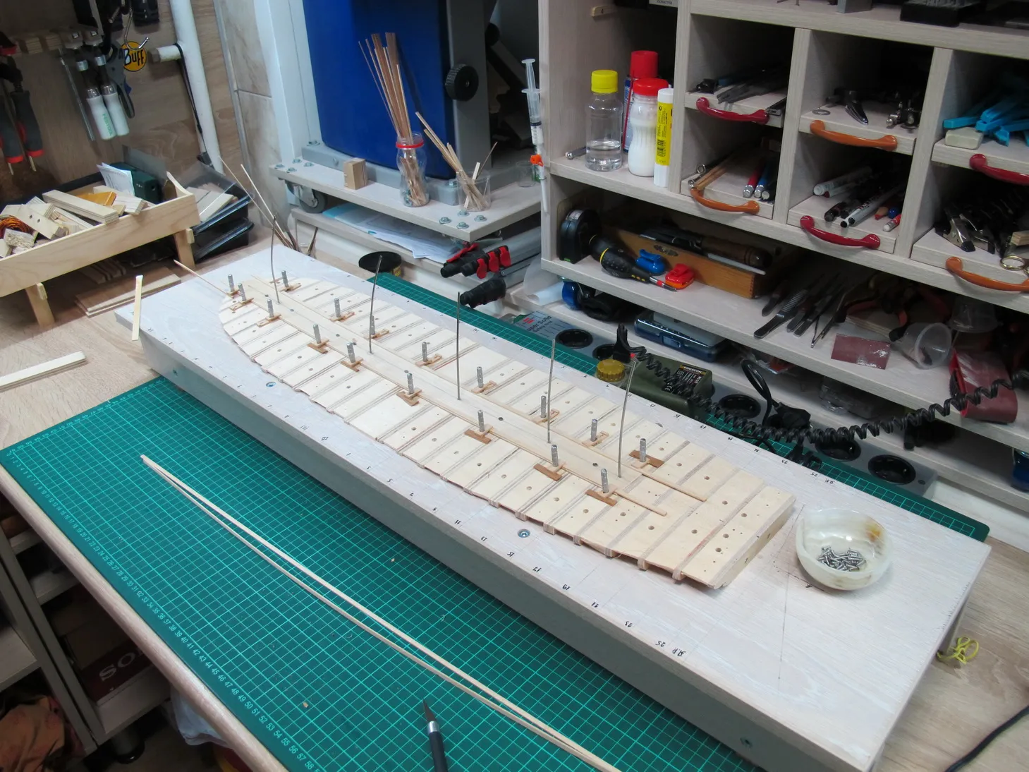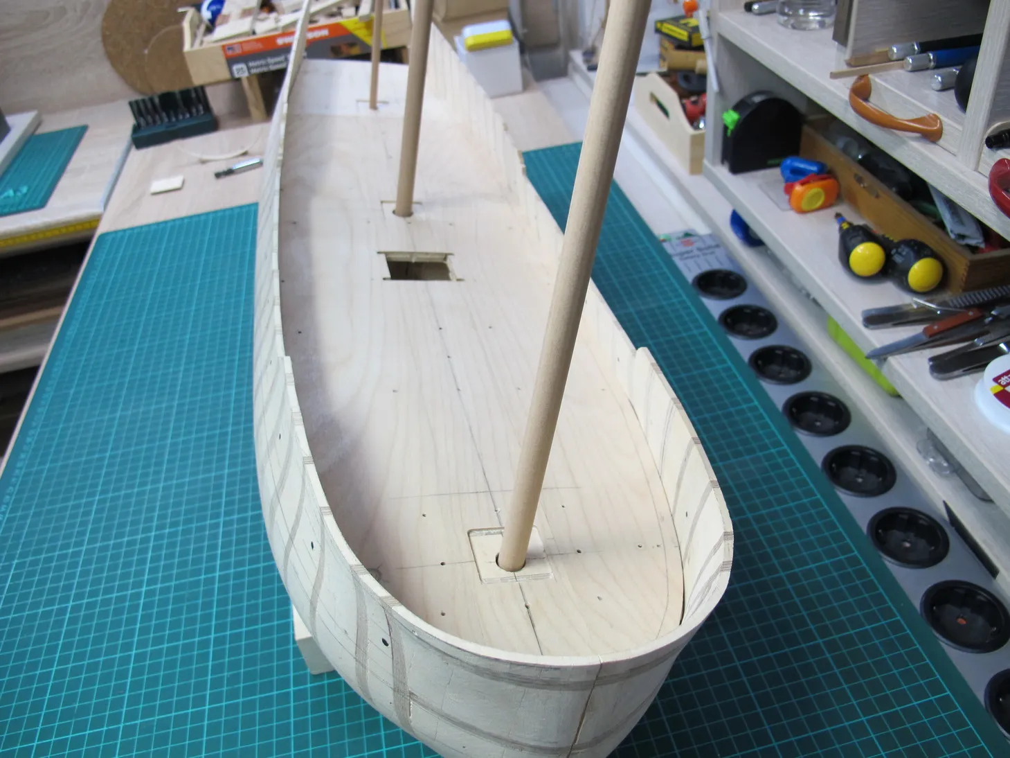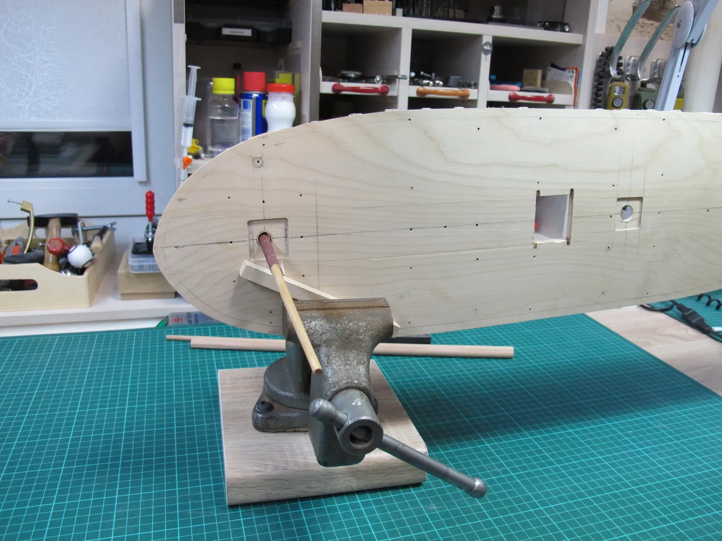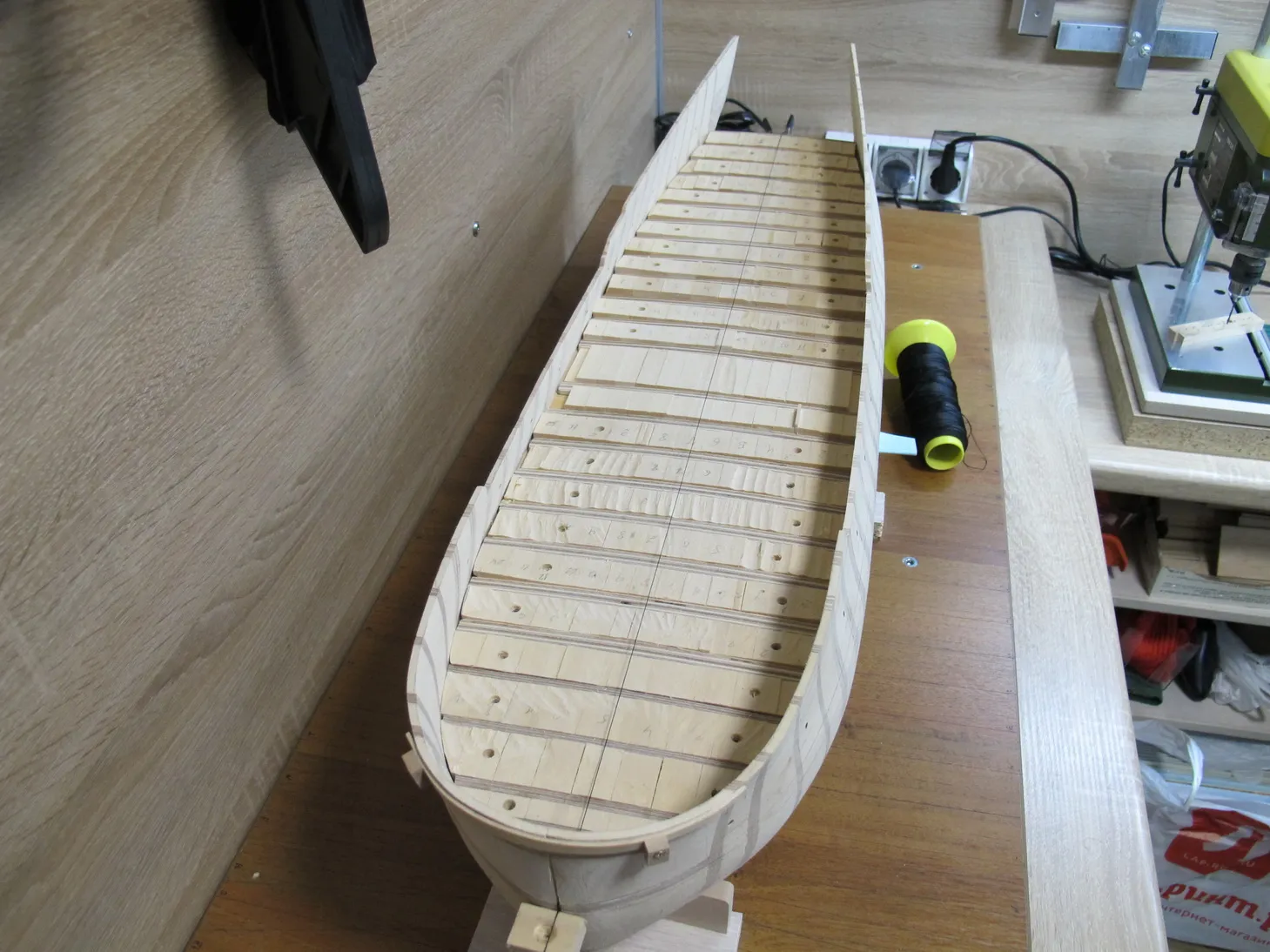 Начинаем набирать основу черновой палубы. Чтобы пернести внешние отметки на внутренню поверхность фальшборта не придумал ничего лучшего, чем засверлиться тонким сверлом в горизонтальной плоскости. Для того, чтобы не завалить отверстие относительно горизонта, сверлил станиной с горизонтально повернутой головкой (фото увы утерял). Далее берем фанерку и подгоняем ее так, чтобы она максимально плотно садилась между бортами, касаясь и бортов и основания. После подгонки вставляем ее на место, просовываем сквозь просверленные отверстия иглы и отбиваем на этой фанерке высоту палубы. Таких фанерок делаем по числу фальшшпангоутов, т.е. получаем фальшбимсы. После по шаблону размечаем на них погибь и отрезаем лишнее. Затем набираем палубу по той же технологии, что и корпус: фанерные бимсы и проставки из липы.