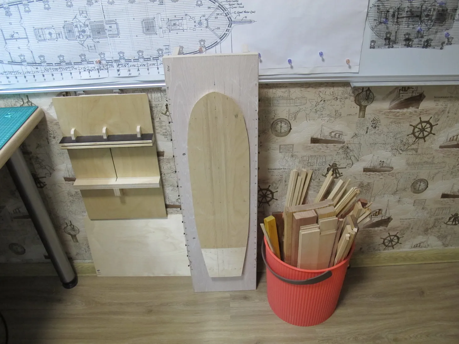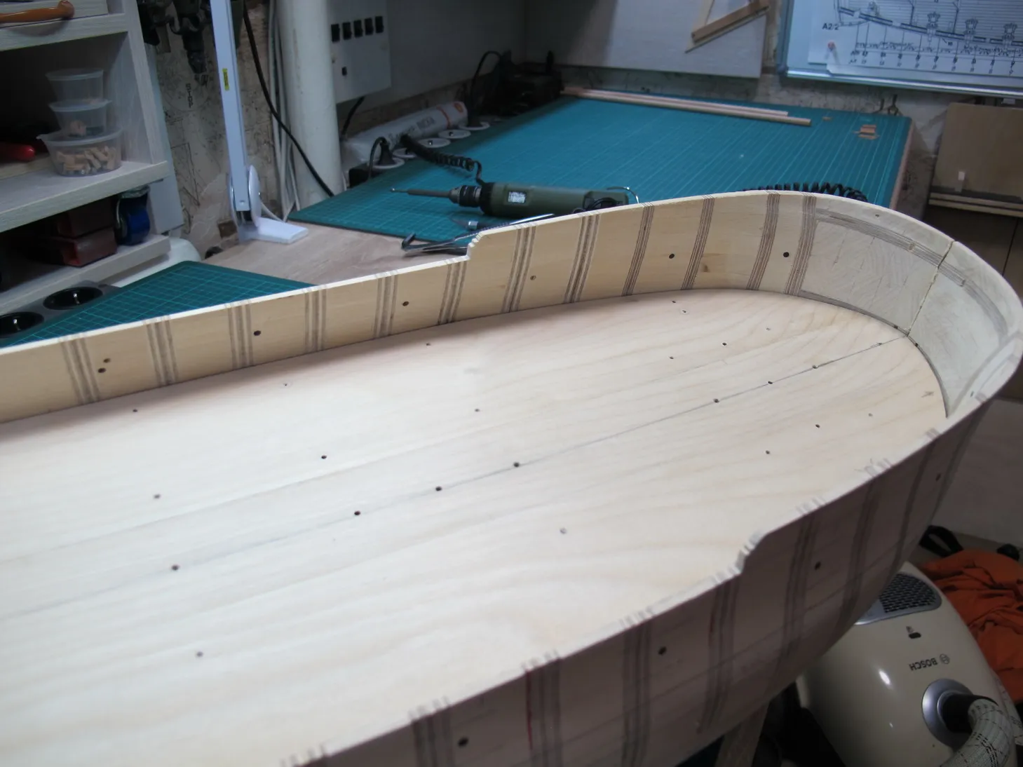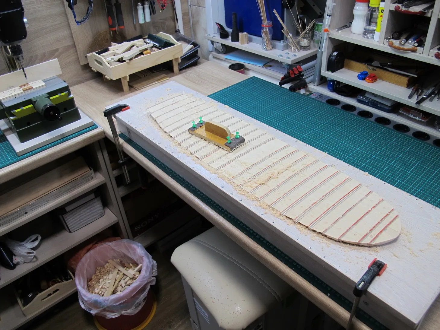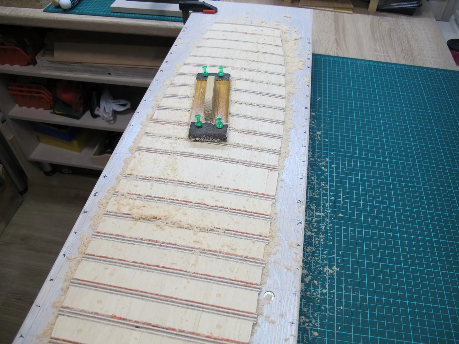 Итак палуба. Основной смысл во всех описанных далее хитросплетениях и извращениях нормального процесса набора палубы в том, чтобы иметь возможность работать с ней отдельно, не будучи ограниченным в движениях и доступе к поверхности палубы бортами корабля. Идея не нова, первый раз я ее увидел у Михаила Безверхнего, но Доктор умело формировал погибь палубы при помощи шлифмашинки, или даже цикли, я уж точно не упомню. В моём случае хотелось сделать наверняка без проб и ошибок, а значит нужен долгий кропотливый процесс, максимально скрадывающий отсутствие навыка, который я по своему обыкновению и выбрал. Постараюсь описать его далее.