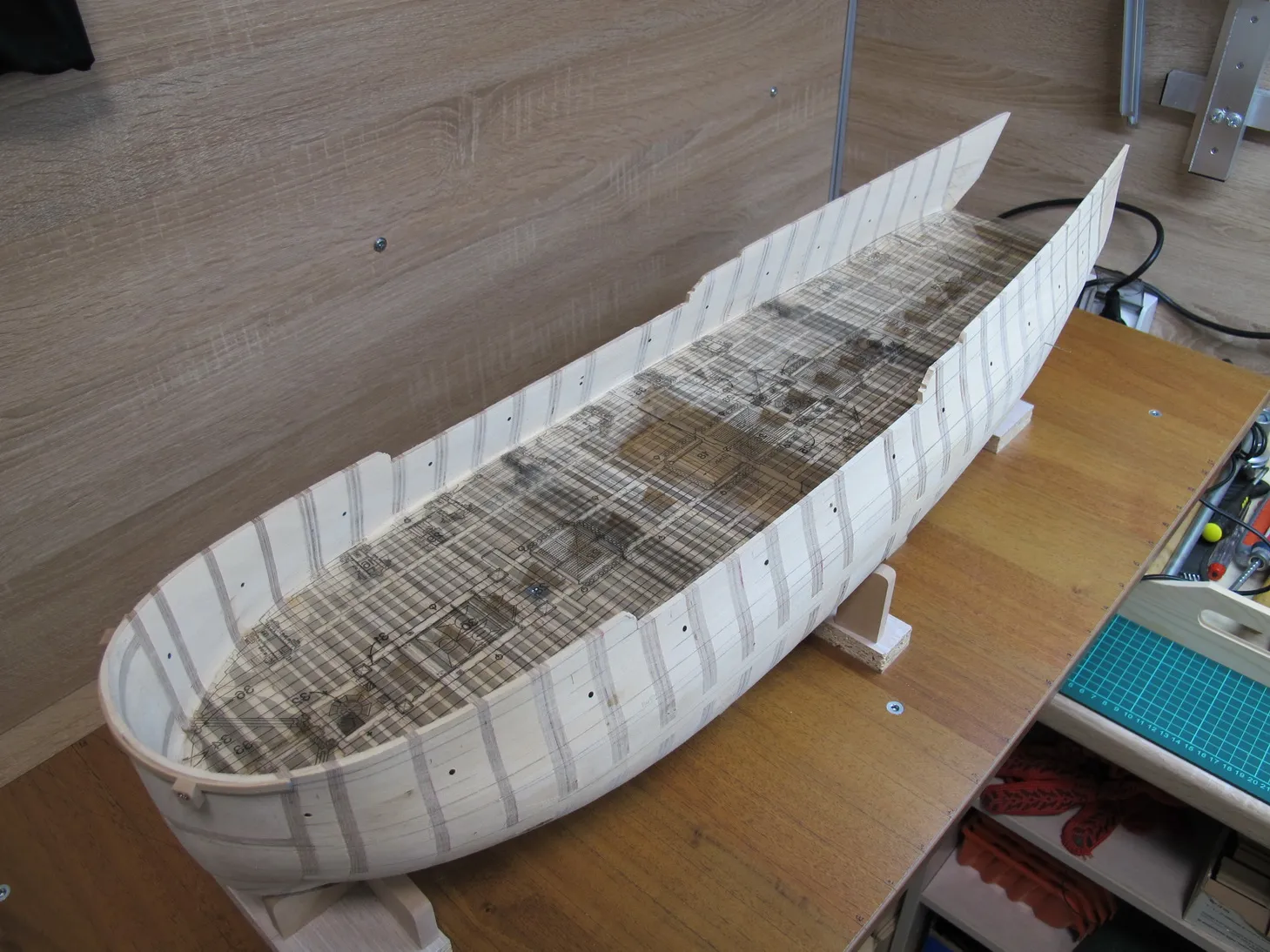 В очередной раз разбираем корпус и водружаем палубу обратно на стапель. Изнанка стапеля: