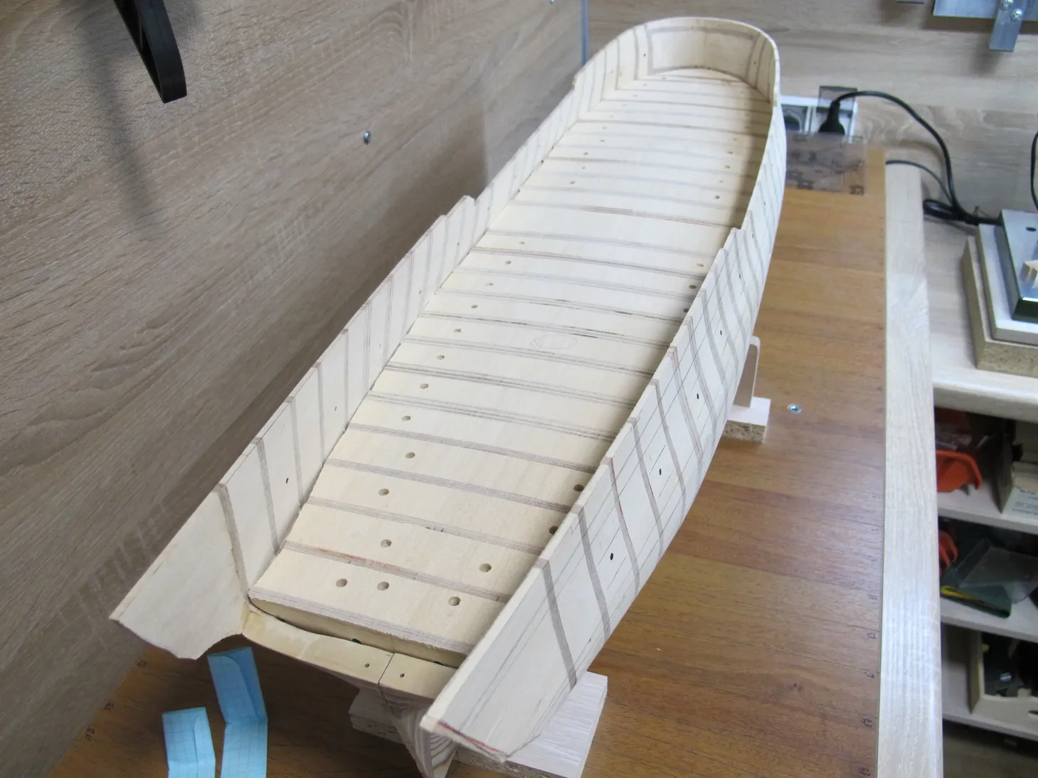 Еще думаю, надо до склейке корпуса сделать внутреннюю обшивку и ее гвоздевание. Так явно удобнее.