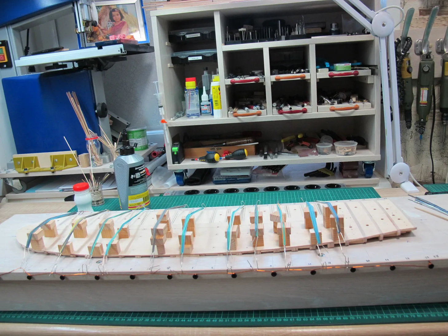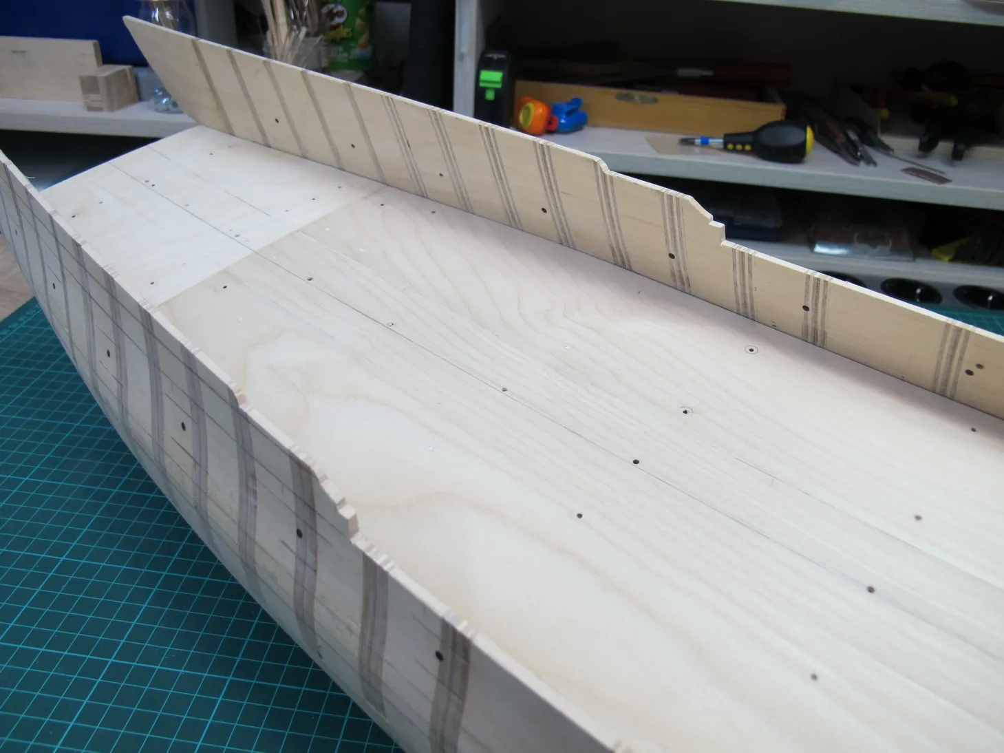 Если приглядеться, можно заметить отверстия в липовых проставках. Дело в том, что палубу нужно притягивать к корпусу, поэтому после схватывания приклееных бобышек, делал в каждом ряду пару отверстий и утапливал в них маленькие саморезы.