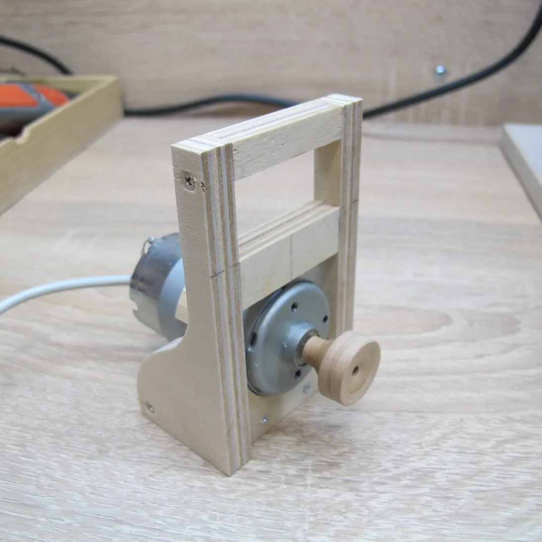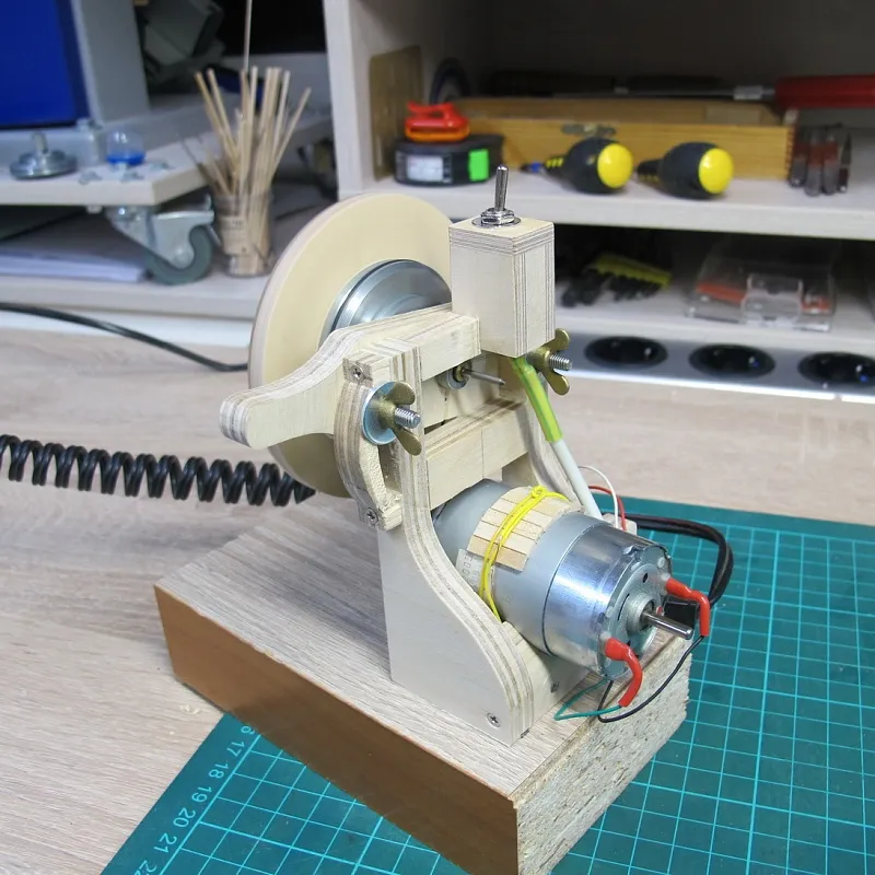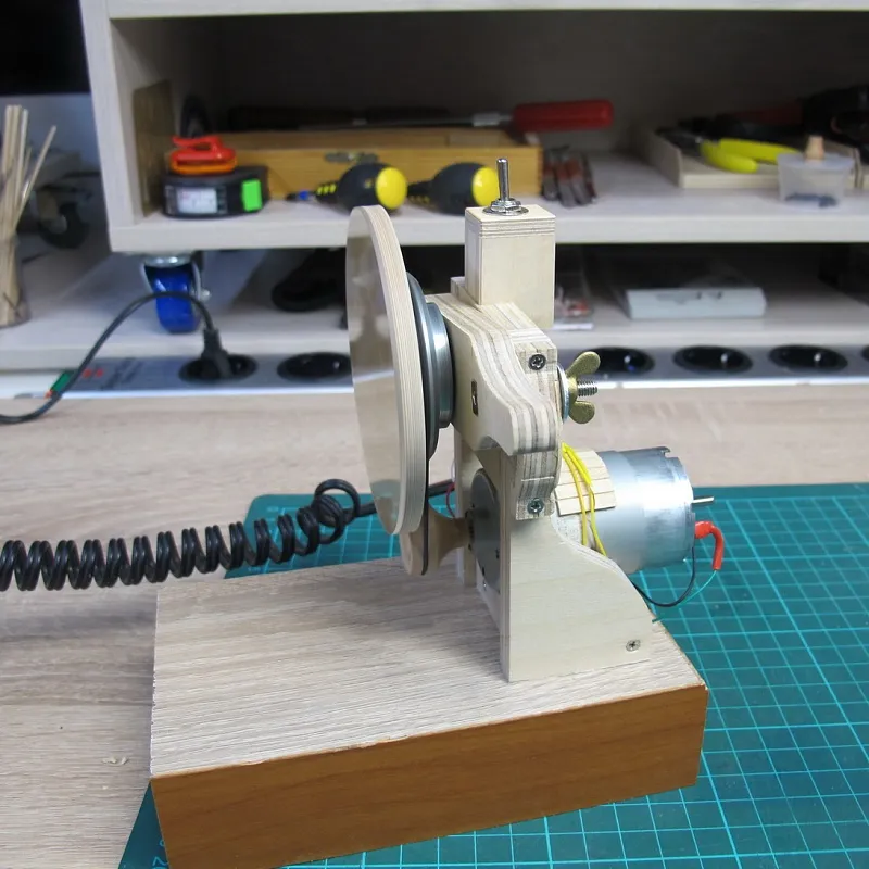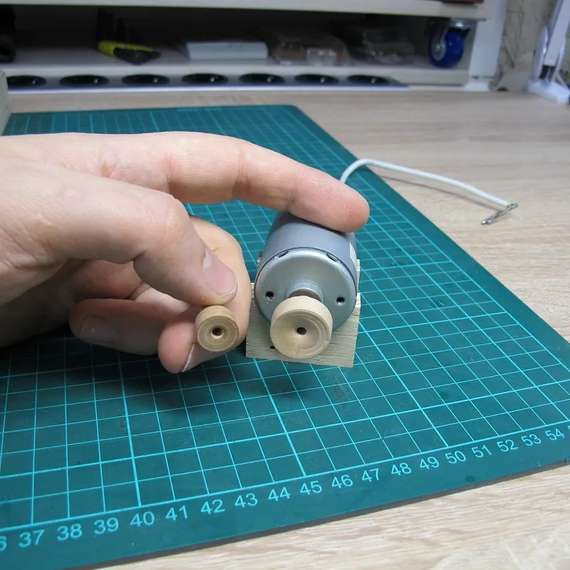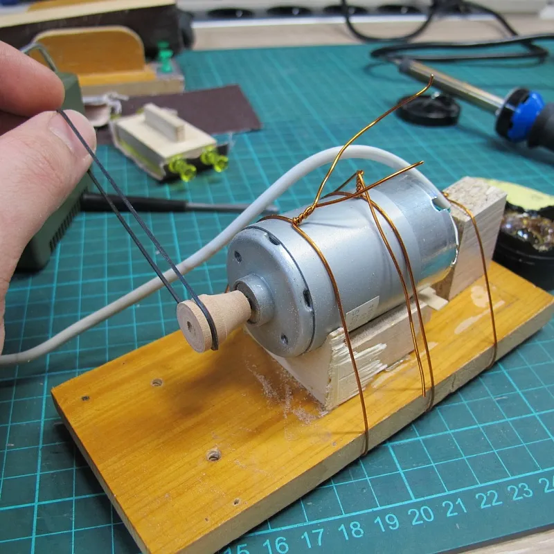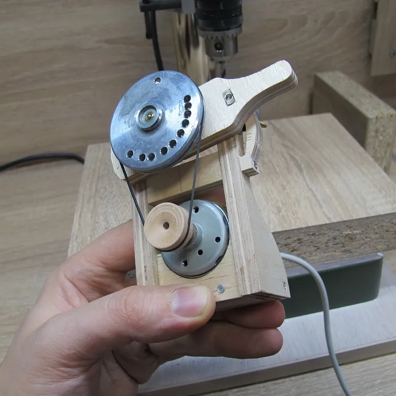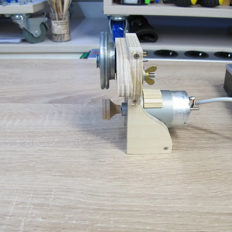 Ну а дальше берем двигатель от старого станочка и пришпандориваем на него деревянный шкив: