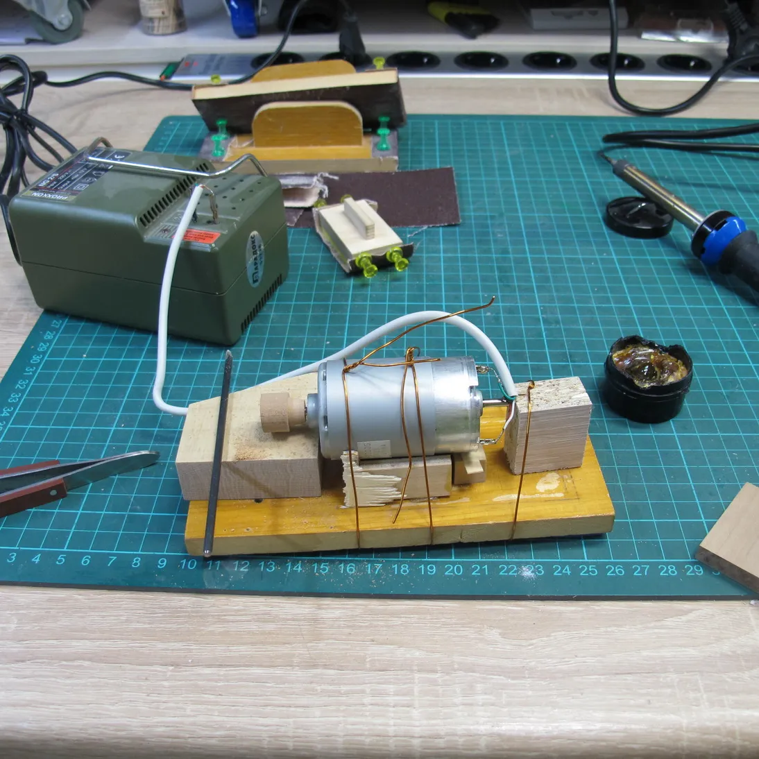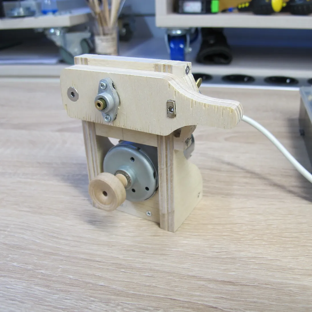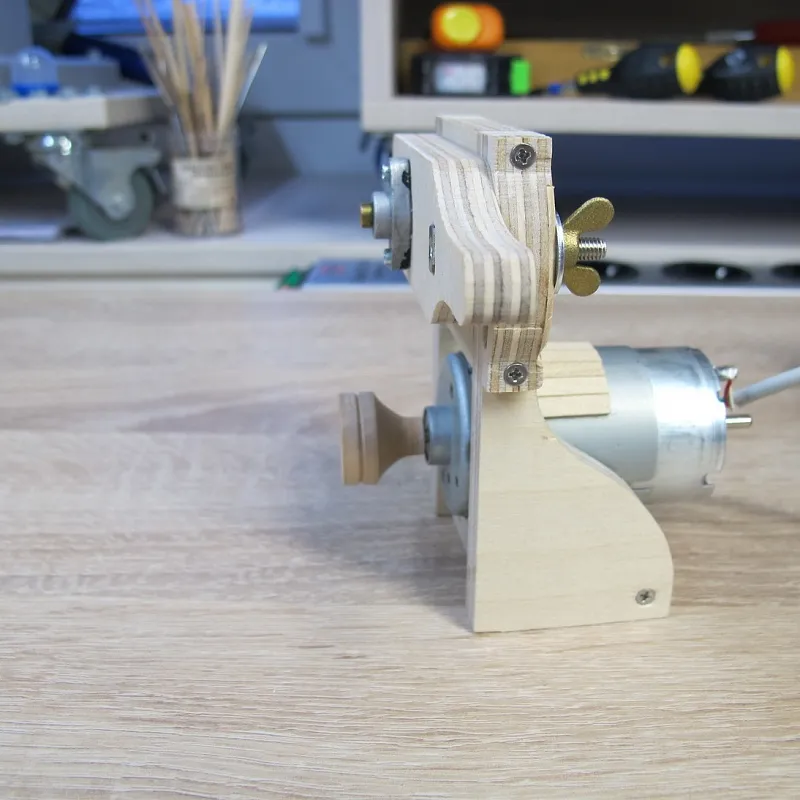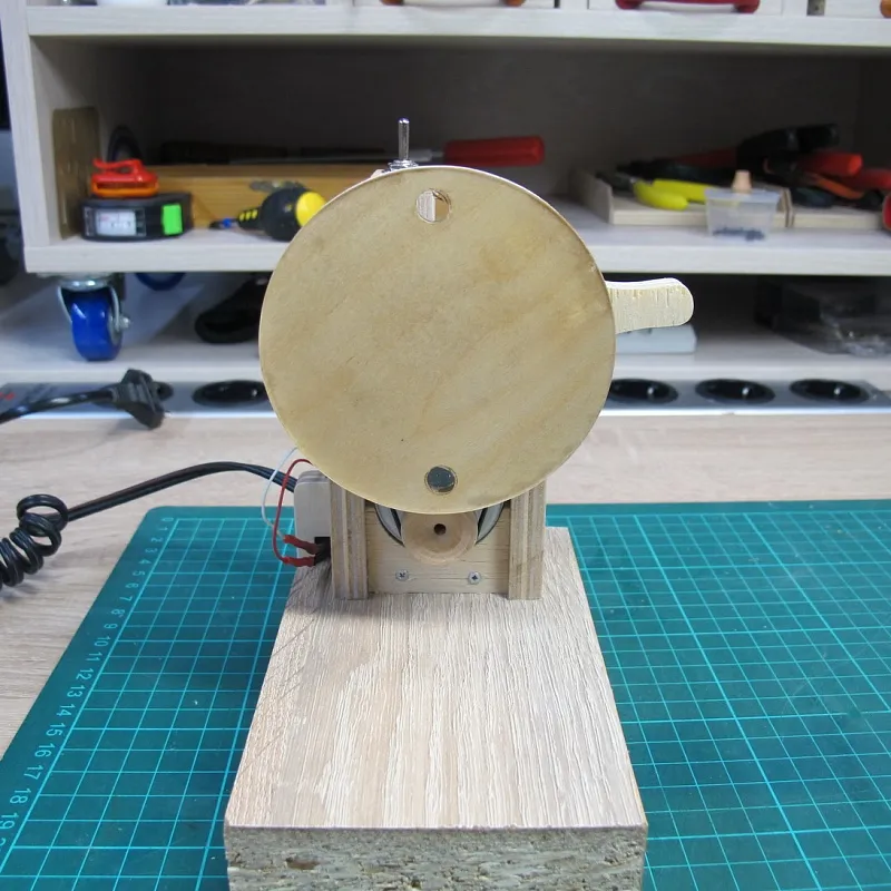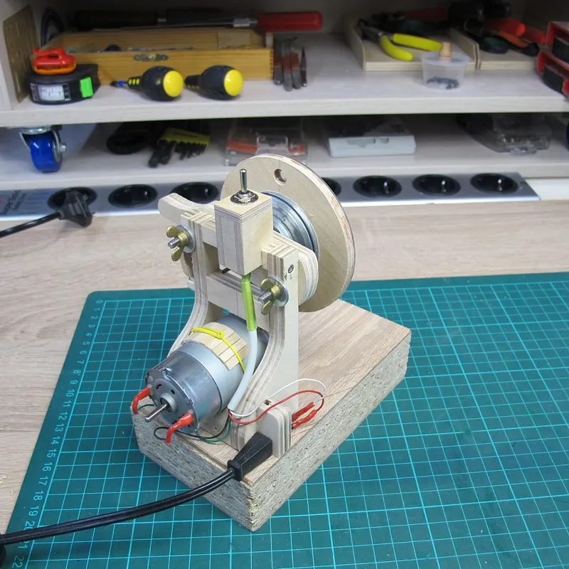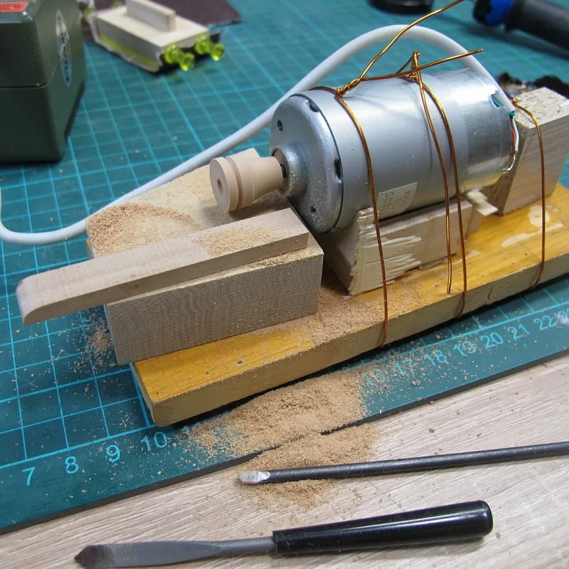 Ну а дальше берем двигатель от старого станочка и пришпандориваем на него деревянный шкив: