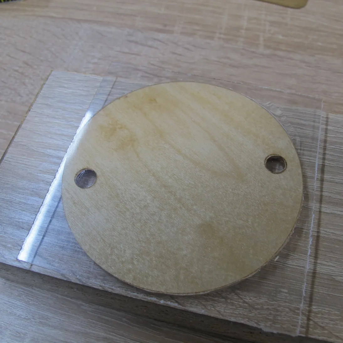 Деревянная поверхность под двусторонний скотч не очень подходит. Мажем эпоксидку и клеим пластик от CD-кейса: