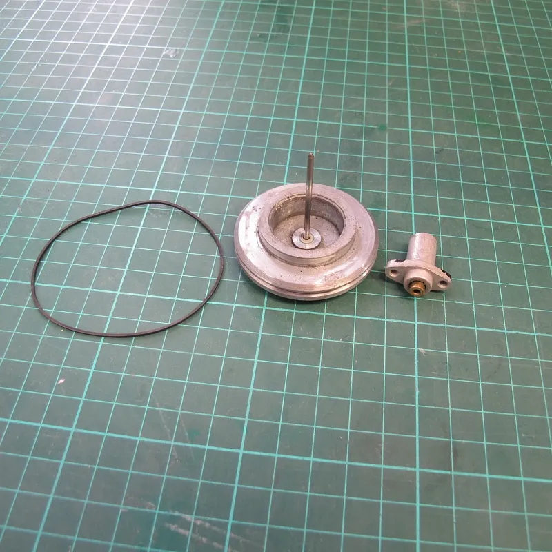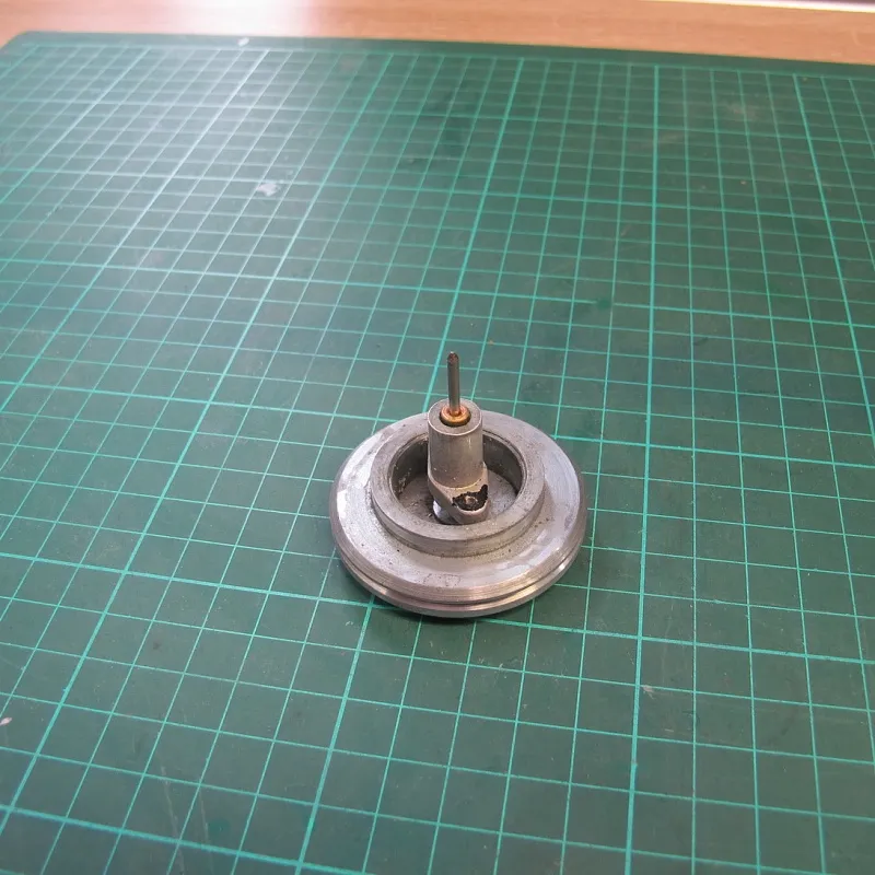 В конце концов нынешней осенью я решил станочек переделать. В мыслях было выточить латунный фланец, к которому привинтить дюралевый диск. В целях реализации этих планов шлифовалка была разобрана, напресованная на вал шестерня сточена резцом до основания. Затем... вдохновение меня покинуло