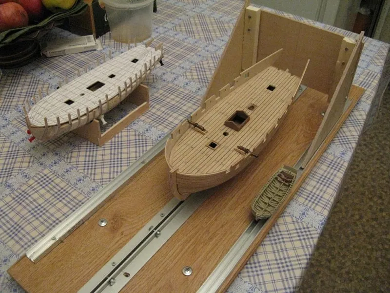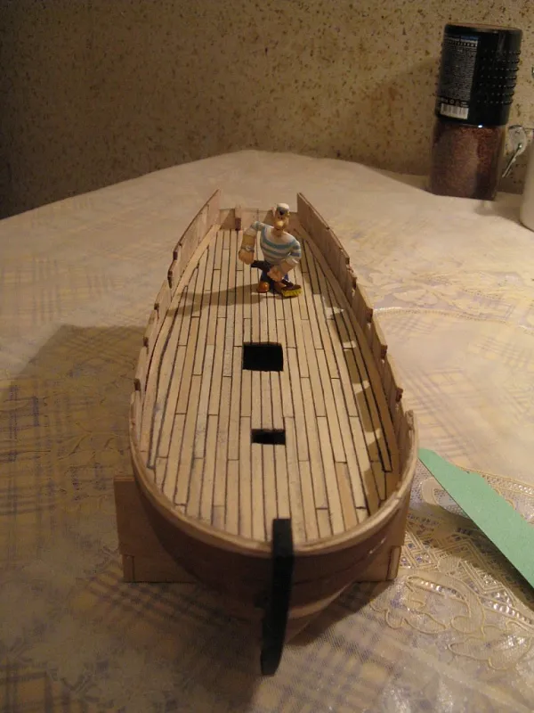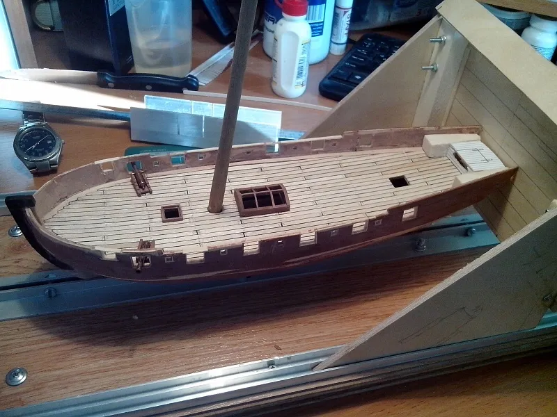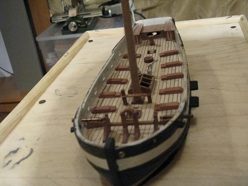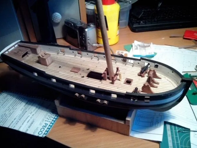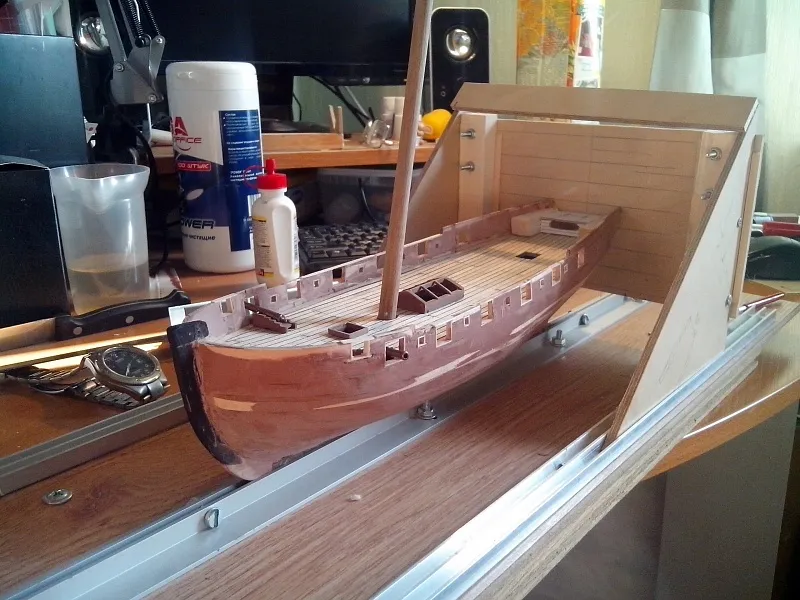 Следующим шагом планирую доделать кормовую надстройку, поставить лестницы в трюм, сделать внутреннюю чистовую обшивку и покрыть матовым лаком палубу и фальшборт, иначе все жутко пачкается или порядок должен быть каким-то другим? Так же на каком этапе работ ставятся утки, планки под нагели и прочую мелочь?