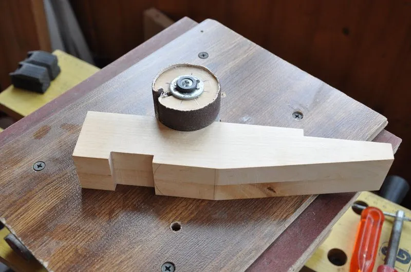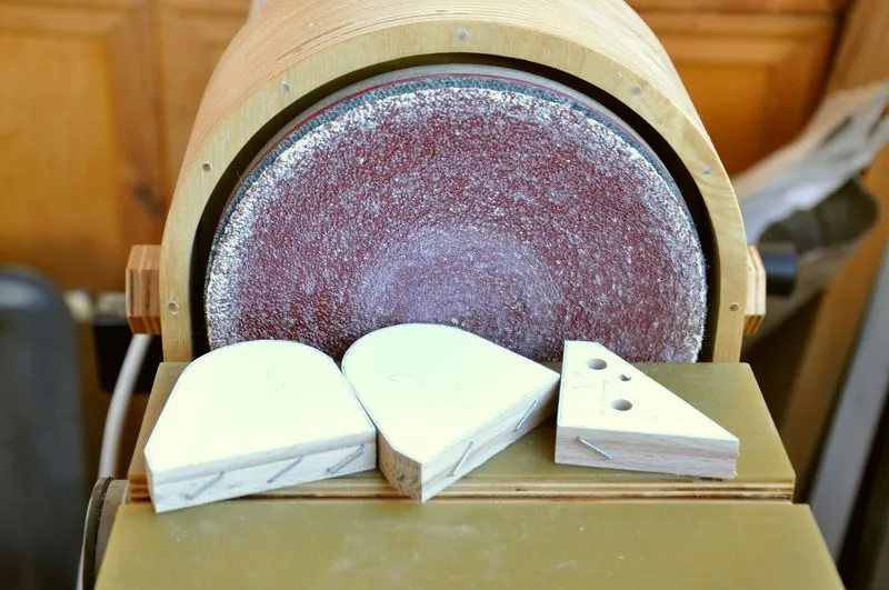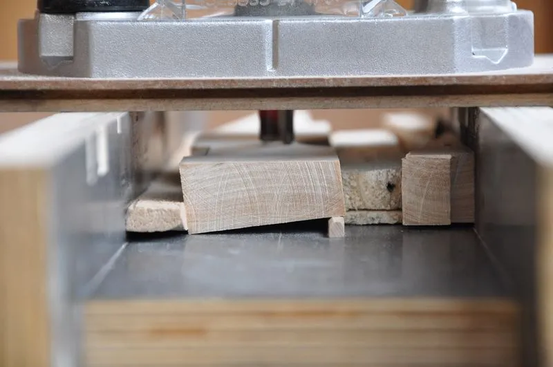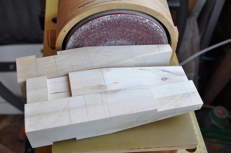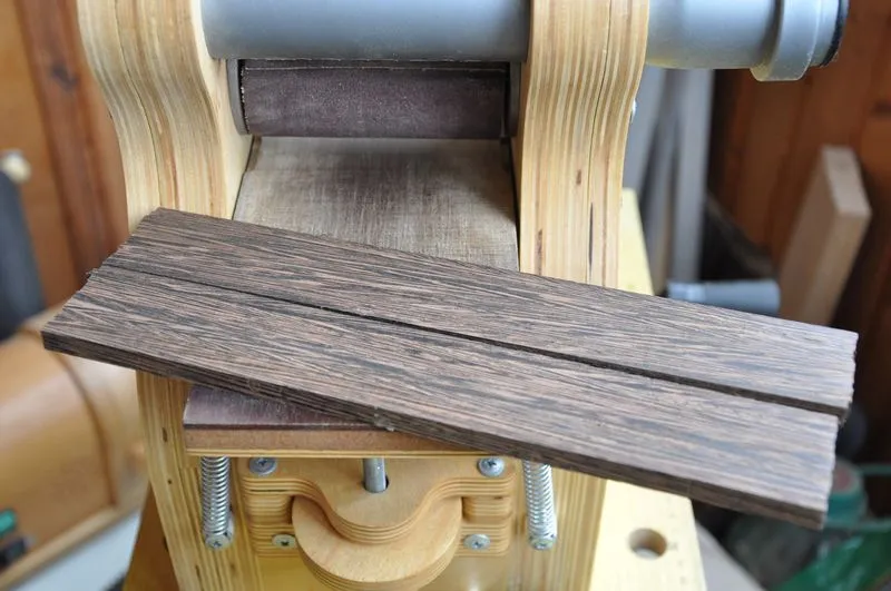 На самом деле, на шлифрейсмусе я заготовку не сгонял в размер. Только подшлифовал. Все было сделано на приспособе с фрезером, просто выступивший клей попросту забил бы всю "шкурку" на барабане.