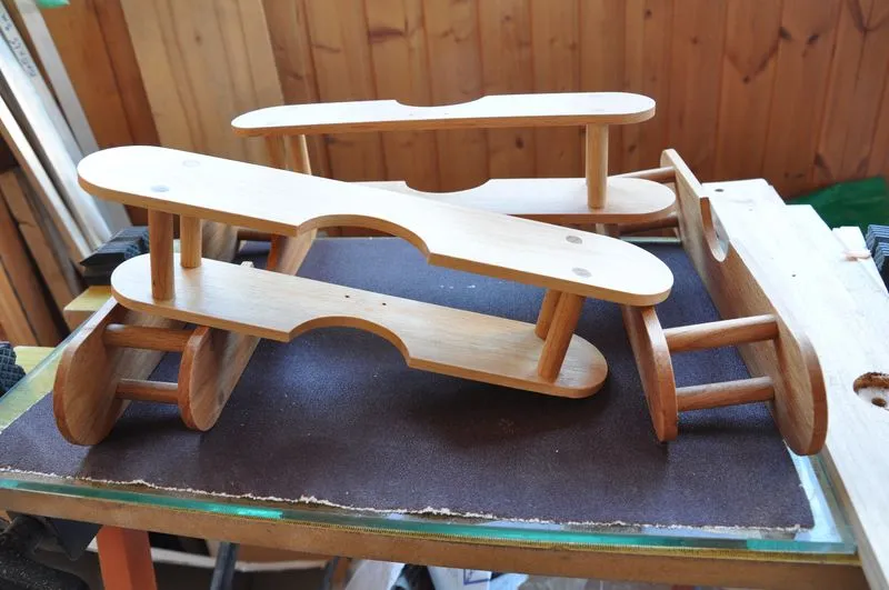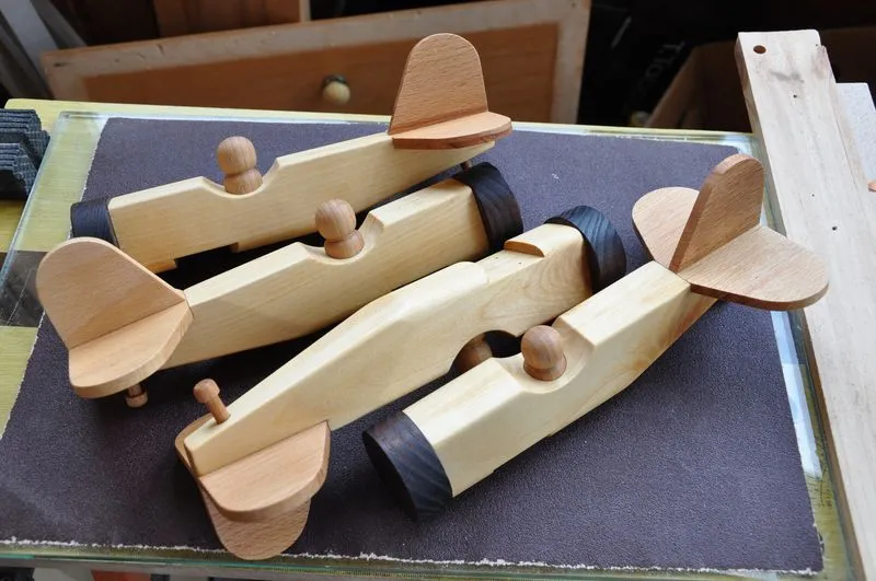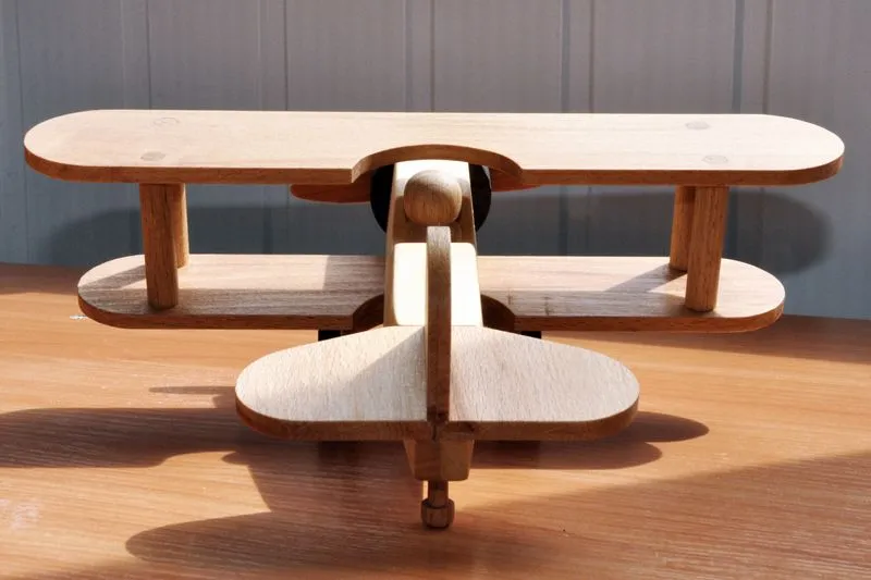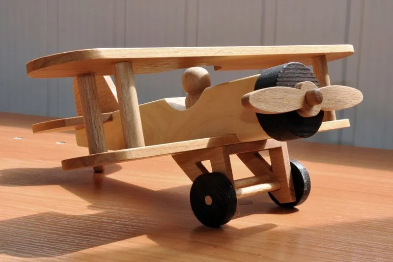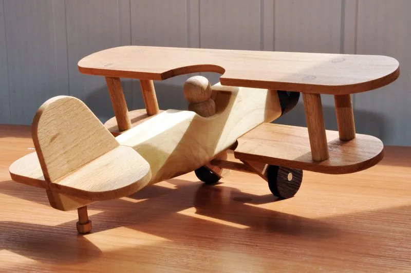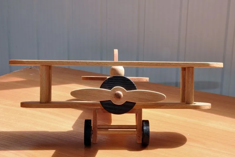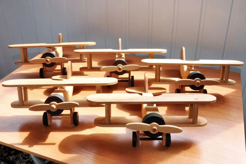 Следующим по очереди в изготовлении игрушек стал биплан. Изготовление старался снимать достаточно подробно, разве что токарные работы опустил, так как они и так понятны. Досок нужной толщины у меня не оказалось, так что решил использовать березовый горбыль из которого сделал 10 заготовок для 5 фюзеляжей.