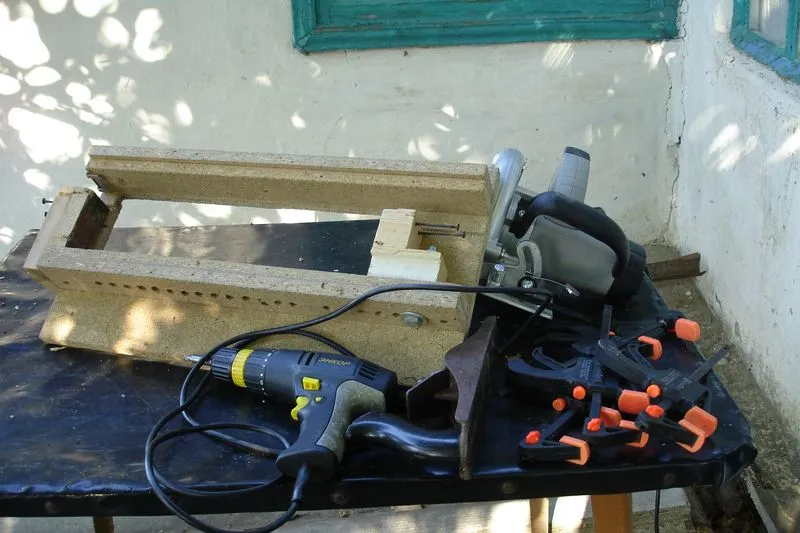 Основные инструменты что использовал: шуруповерт (для фиксации заготовки шурупами), струбцины, рубанок (для строгания неотпилившихся кромок), ручная дисковая пила и специальная приспособа (для закрепления в ней заготовки и точного прохода пилы).