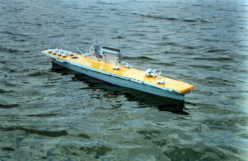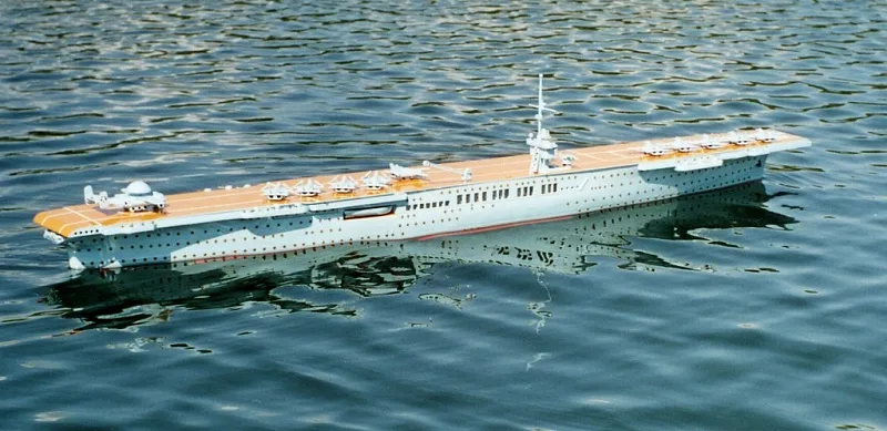 Насчёт корпусов авианосца и крейсера Миоко довольно интересная история. Некогда эти корпуса являлись крейсером "Аврора" в масштабе 1:100 Ну, куда же без "Авроры" во времена нашей молодости? Модель тоже была плавающая, причём, как тогда, так и теперь, максимальные размеры лимитировались габаритами ванны, а это 130см. максимум. Корпус модели был долблёным из двух толстых досок с помощью рубанка и полукруглой стамески (4кг. деревянной стружки). Разнимался по ватерлинии, покрашен был жуткими красками того времени и от контакта с водой рассыхался и кривобочился. Да и общее качество было не очень. Но главным разрушающим фактором явилось любопытство малолетних зрителей. Например, выковыривание капсулей из которых были сделаны иллюминаторы.