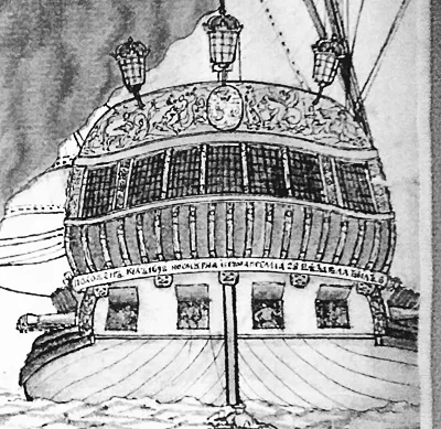 П.Бергман. «Гото Предестинация». Чертеж. 1700.Фрагмент вида сзади корабля. Собрание ЦВММ. |