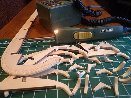 Кроме этого, с помощью нехитрого приспособления для гравировки (между прочим очень легкого и удобного) от Proxxon-а сотворил типа резьбу по дереву на заранее запланированные части киля. Слово "типа" употребляется, чтобы разграничить настоящую резьбу, и ту примитивную, полунаскальную живопись, исполненную мной. Вот когда я пожалел об отсутствующих резчиках по фигурным деталям, упомянутых выше. Единственное, что могу сказать в свое оправдание, подобный "изысканный кубизм" встречается на шее и частично голове дракона, украшавшего штевень корабля, найденного в устье реки Шельды.