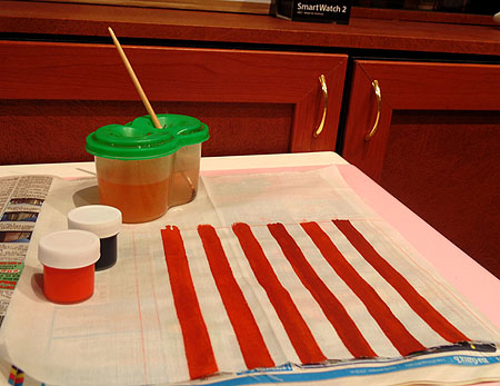 Пришло время уделить некоторое время, тому самому, несколько раз упомянутому парусу. Производитель кита предлагает сделать довольно странную конструкцию — на цельное полотнище наклеить по диагонали крест-накрест 3-4 мм полоски из него же. Снова не буду здесь приводить прямо противоположные мнения уважаемых людей о камнях с Готланда с изображениями кораблей, плывущих с развернутым парусом. Где паруса, как правило, покрыты узором из ромбов, в то время как письменные источники утверждают, что паруса раскрашены полосками контрастных цветов. То ли готландцы предпочитали другие узоры, то ли, что более вероятно, ромбы изображают сеть из канатов или кожаных ремней, которая покрывала поверхность слабо сотканного паруса, укрепляя его. Окунувшись в массу предположений и гипотез, я понял одно, раз нет точных фактов, то базироваться буду на тех, которые получили наибольшее распространение. К тому же основные сведения для себя я почерпнул из книги "Суда викингов" Иохена фон Фиркса, поэтому и буду продолжать основываться на заключениях автора. Это, в частности, касается полосатого паруса, сшитого из шерсти. Решив для себя отказаться от шерсти, но не от красно-белых полос, долго решал, как этого добиться. Сшивать разноцветные полосы, пусть и в 50-ом масштабе, по мне так не очень, швы при любом раскладе будут не масштабные, да и добиться ровности, с моим зачаточным мастерством швеи, большая проблема. После нескольких экспериментов я все-таки нашел выход. Красным карандашом нарисовал на ткани необходимый рисунок, затем разукрасил его акриловой краской с двух сторон. После высыхания ткань подверглась и механическому воздействию и лежанию в горячем крепком чае, но показала очень хорошую стойкость окраски. После чего осталось лишь сделать имитацию швов прострочкой на швейной машинке по краям нарисованных полос.