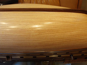 рейками ореха, затемненными морилкой под палисандр, после удаления частей шпангоутов и обшивки палуб