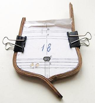 'Пакет' – склеенные из нескольких слоев тонкого шпона (0,6 мм) листы или полосы. Типа фанеры, только волокна у всех слоев идут в одном направлении. Клеить обязательно ПВА, т.к. в дальнейшем при нагревании утюгом клей размягчается, что и позволяет такому 'пакету' легко гнуться.