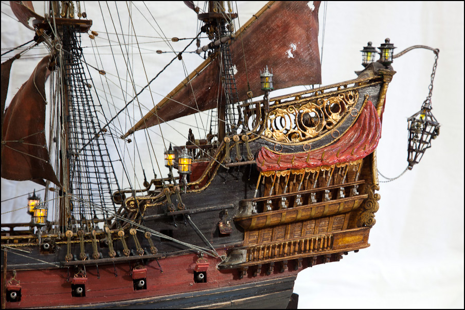 Хочу предложить вашему вниманию очередной мой самодел и как продолжение из темы киносаги "Пираты Карибского моря". На этот раз пусть будет корабль Эдварда Хича (Черной Бороды)" Месть королевы Анны" ("Queen Anne`s Revenge"). Коль уже не секрет и не домыслы, что МКА голливудские инженера и дизайнеры сотворили на базе Черной Жемчужины, то и мне пришлось в своем творчестве идти по той же тропе. Только для этого мне пришлось приобрести в "Союзпечати" восемь первых номеров журнала "Собери Черную Жемчужину" для скелета корабля, а остальное уже все сделано самим. Использованы фотографии первоисточника из интернета и кадры фильма. Фигурки, орудия и элементы декора изготовлены из термопасты Sculpey и эпоксилина. Фонари функционируют на светодиодах.