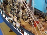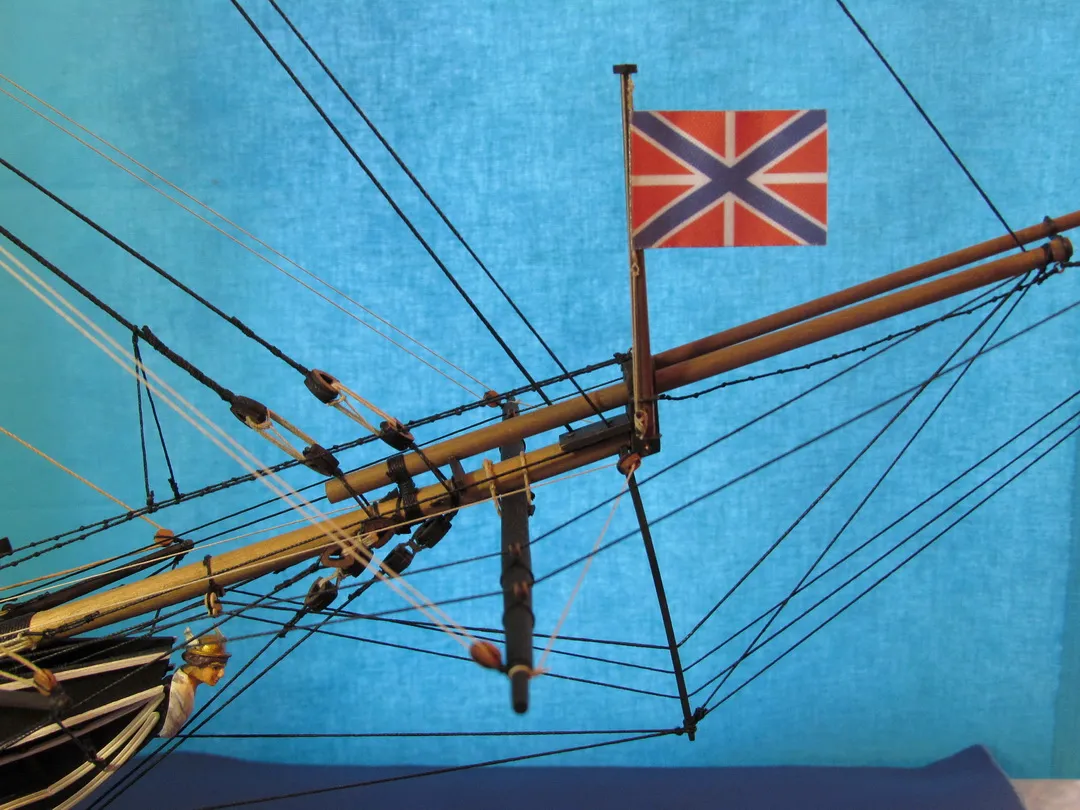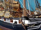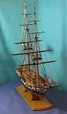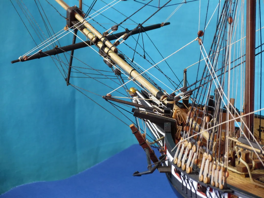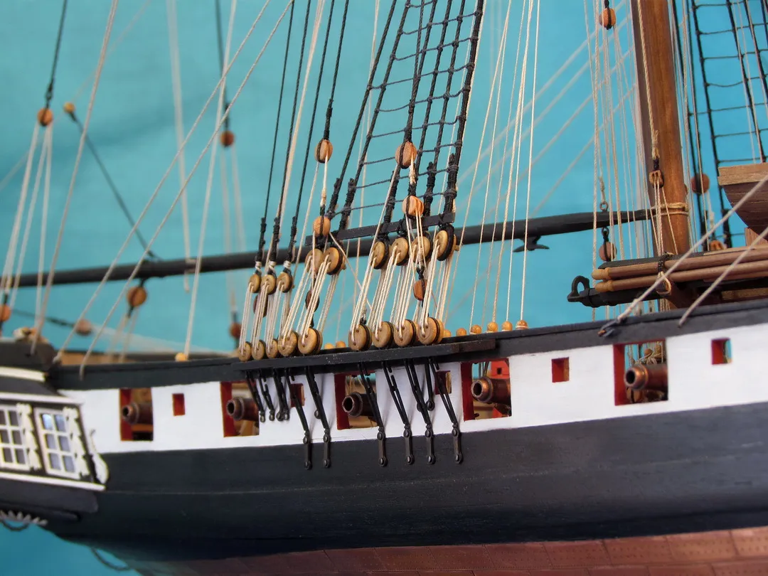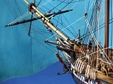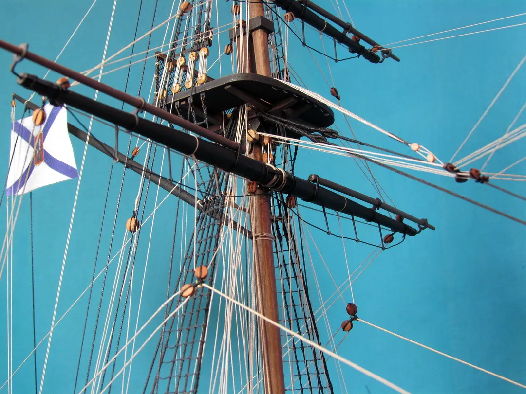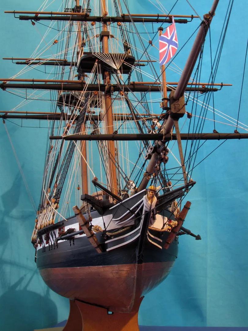 Моя первая деревянная модель. Модель выполнена из набора Амати в масштабе 1/64, глобальных переделок не планировалось, но некоторые доработки и переделки все же имели место. Штурвал и помпы сделаны заново, изготовлена якорная машинка, мусинги штагов плетеные, сделаны кольца для брюка в вингардах каронад, выполнена полная обвязка орудий, переразмерен такелаж, выполнен настил марсовых площадок и доработано ограждение марсов, на вантах установлена деревянная распорка и швиц-сарвень, выполнена клетневка вант и огонов. Во время изготовления изучал и применял информацию из таких книг как: Глотов "Изъяснение принадлежностей к Вооружению корабля", Ильин "Практическая морская артиллерия", Посьет "Вооружение военных судов".