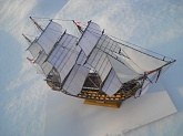 модель делалась из журнала "Maly Modelarz (2005.10-11-12)" с доработками: про грунтовано, прошпаклевано и покрашено днище корпуса. доработан такелаж корабля. паруса: пропитанная клеем пва ткань, распечатанные на принтере. юферсы и блоки сделаны из пластика. рангоут бумажный со вставленной стальной проволокой внутрь мачт и рей.