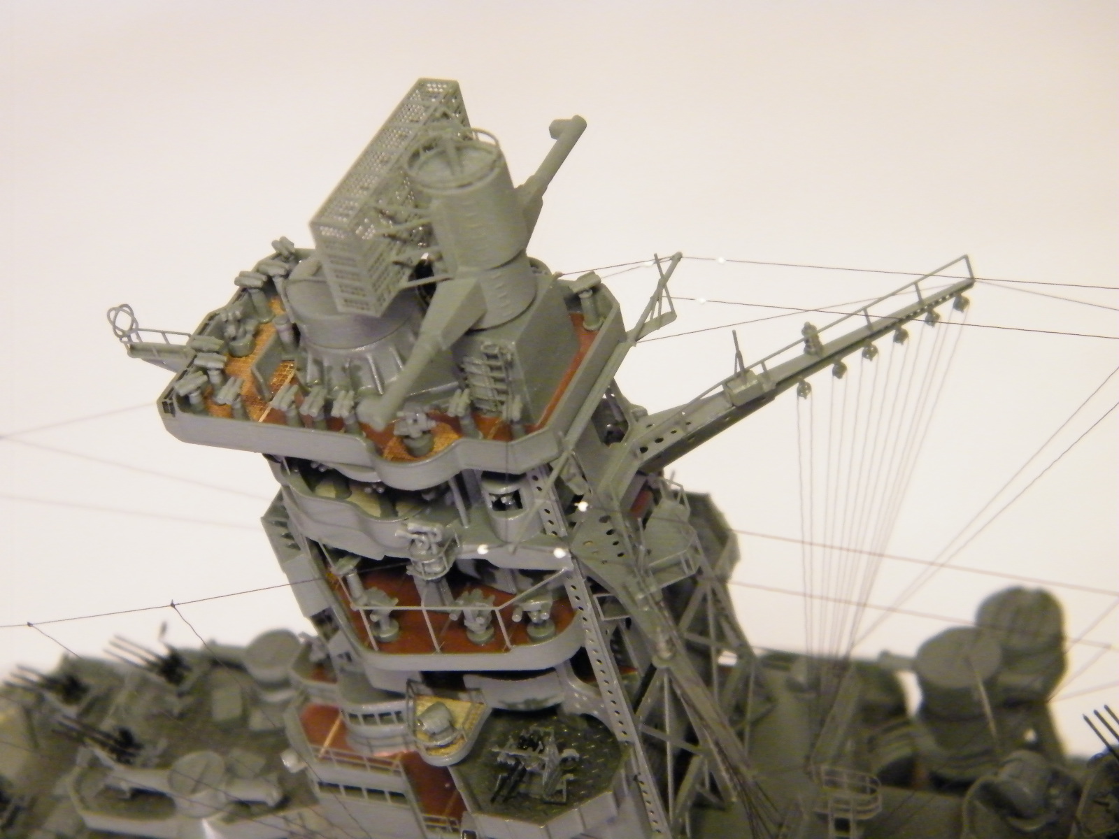 Пластиковая модель фирмы Fujimi, масштаб 1:350. Готовая модель повторяет конфигурацию корабля на момент гибели в 1944-м году. Использовался набор дополнительного травления Fujimi, некоторые пластиковые и травленые элементы других производителей. Часть рангоута, флагшток и гюйсшток заменены на металлические трубочки и стержни. Исправлена форма казематов. Немасштабные установки 127мм зениток заменены на травленые фирмы Voyager, 25мм зенитки заменены на травленку LionRoar. Стволы ГК, 152мм и 127мм - заменены на точеные . Такелаж - нитка от бантика. Окраска акрил Тамии, линейка "IJN" цветов. Попытался изобразить старение окраски - линкор использовался во время войны очень активно, и на момент гибели давно был в море: Корабль был торпедирован на переходе из Брунея в метрополию после катастрофического для японцев сражения в заливе Лейте.