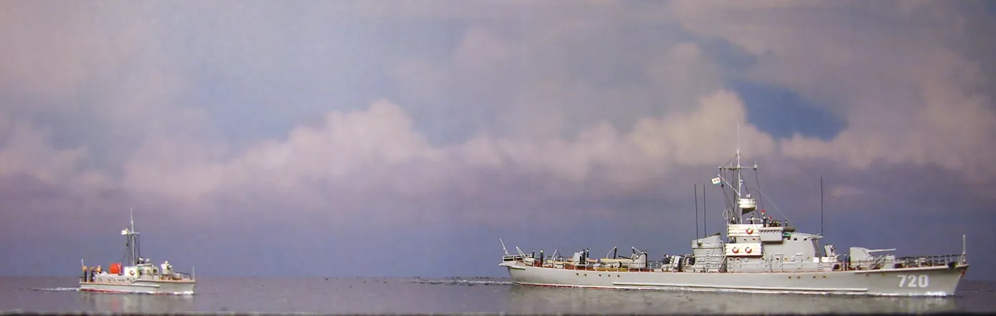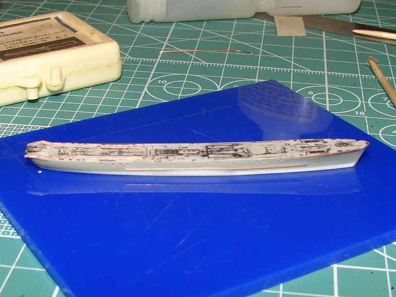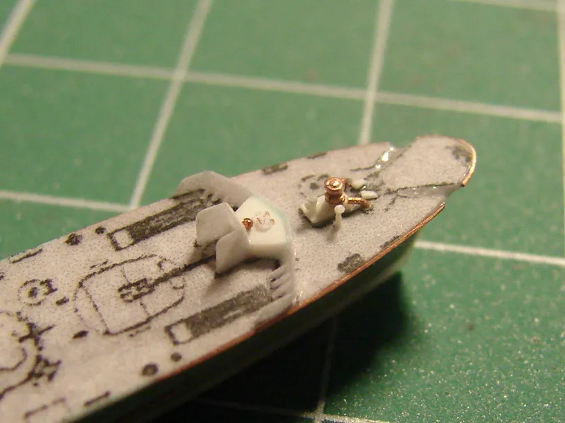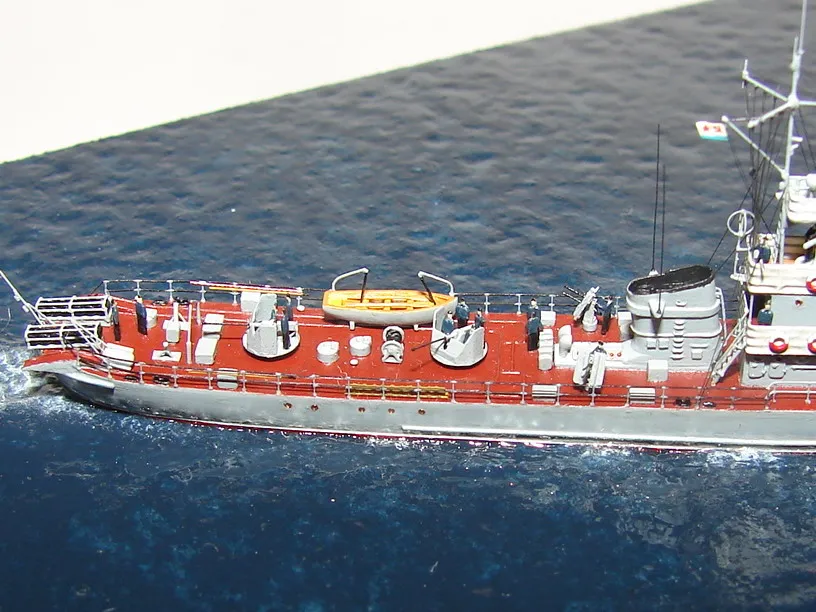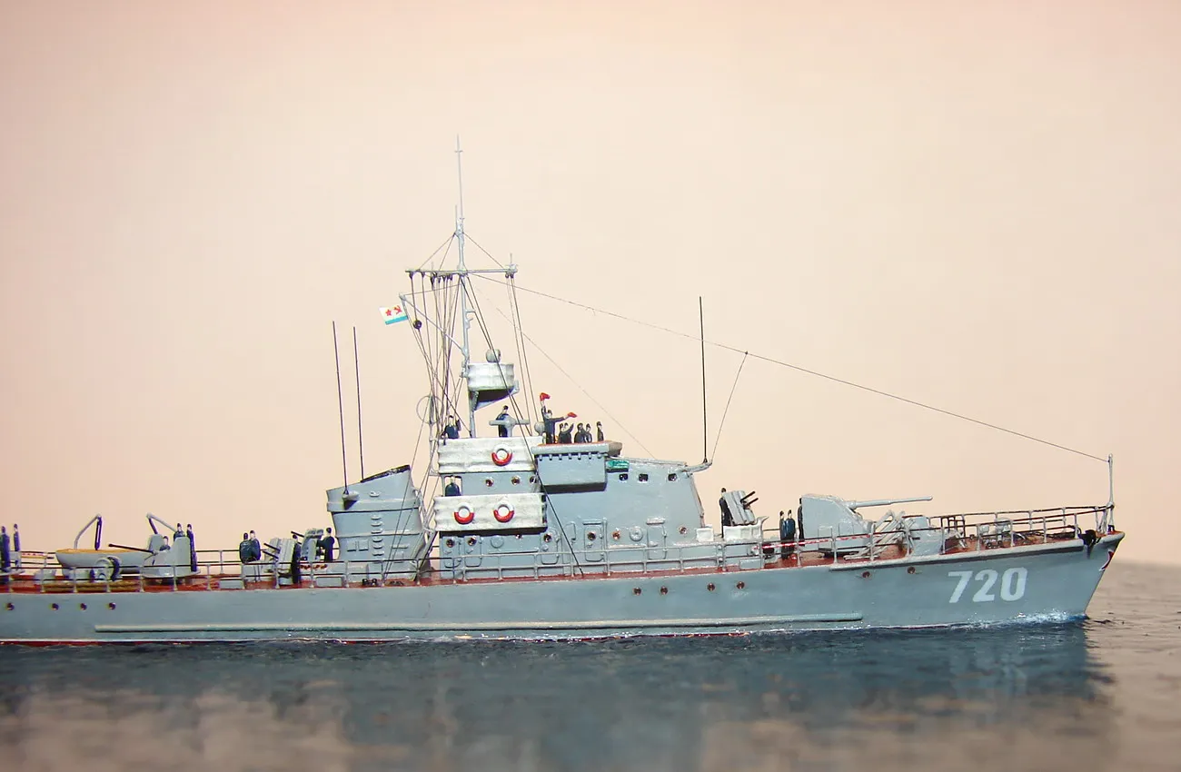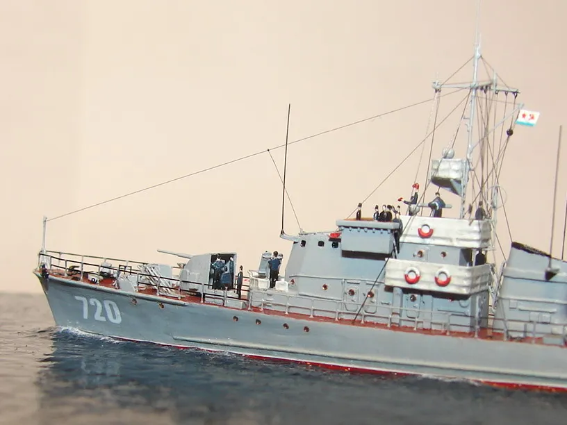 Модель построена в масштабе 1/700 практически "с нуля". За основу был взят набор от фирмы Комбриг, но так как все детали в наборе были "кривые" или с браком, проще было всё сделать самостоятельно. Модель строилась по чертежам и фотографиям из двух монографий посвящённых кораблям этого проекта и материалам из Интернета . Из набора взяты только три детали, которые более-менее можно было использовать в постройке модели: корпус, ходовая рубка, дымовая труба /на фотографиях процесса постройки они выглядят серо-зелёными/. Так как корпус тонкий и длинный, его повело «бананом». Для выравнивания, к нижней части корпуса было прикреплено металлическое ребро жесткости на двух винтиках с гайками. Вся остальная деталировка изготавливалась самостоятельно из пластика, проволоки, элементов разных фототравленых деталей и пропитанной супер-клеем бумаги. Такелаж изготовлен из тянутого литника и тонкой капроновой нити 0.03мм. Из фабричных деталей использовалось фототравление от GMM и WEM: леера, трапы, вьюшки, фигурки моряков. Бортовые номера, эмблема и флаги сделаны из декалей подходящего размера. Модель окрашены кистью водно-растворимыми красками АКАН. Модель из общей диорамы "Корабли Ленинградской ВМБ на учениях"