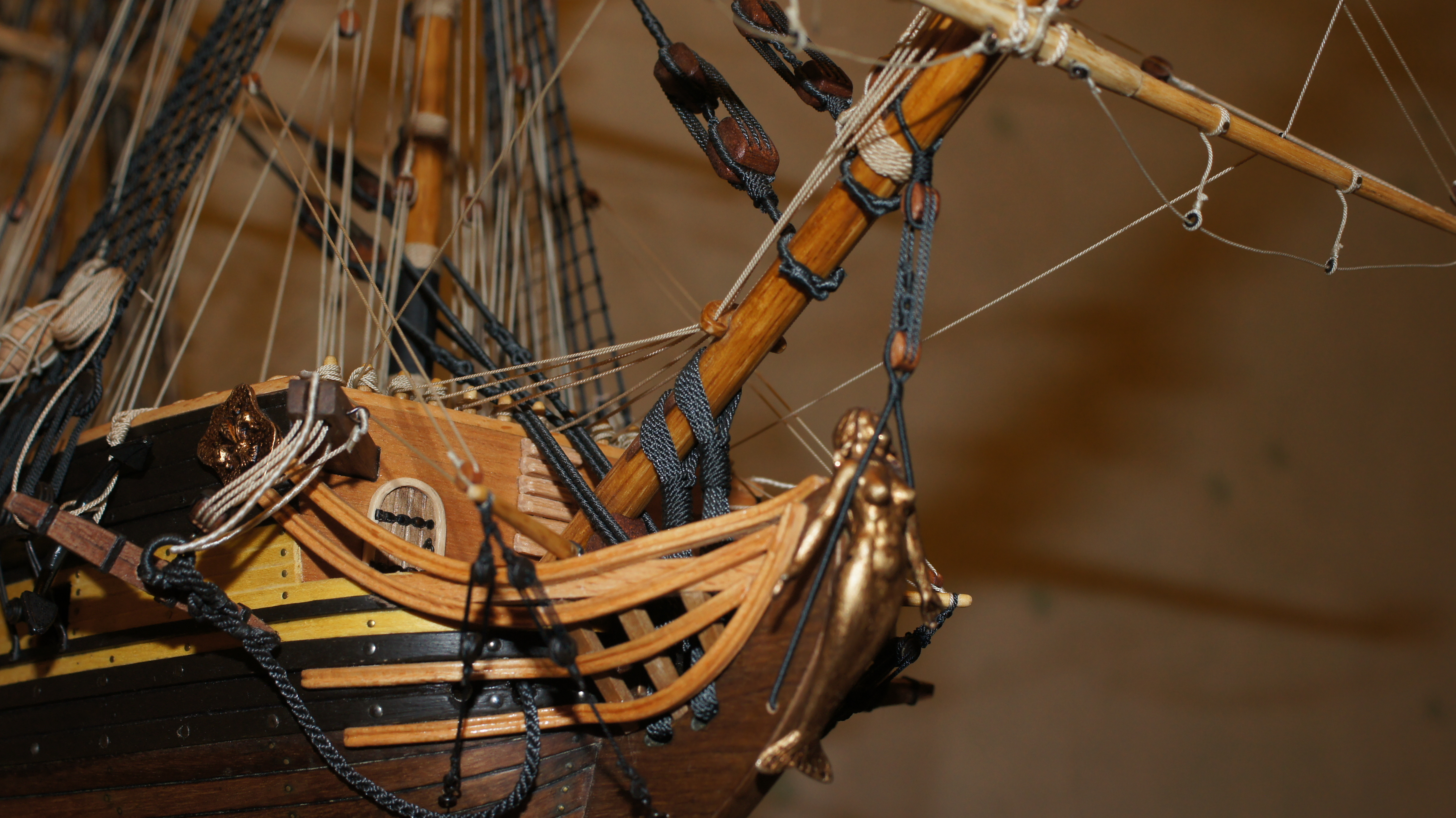 Модель фирмы COREL изготовлена в масштабе 1:75, длина 840мм, высота 705 мм, ширина 290 мм. Набор постигли глобальные переделки. В первую очередь прорезал нижнюю палубу. Потом довёл до ума пушки: сделал пушечные и откатные тали, противооткатный брюк, оковал железом колёса. В палубном настиле каждая точка – деревянный гвоздь. Добавил к набору шлюпки и кормовые фонари. Нижняя шлюпка – покупной набор, верхняя с вёслами - собственное творчество. Заменил все блоки , эзельгофты и нитки на кручёные канаты. К якорям добавил томбуи. В конце повесил новые флаги и вымпелы приобретённые на сайте «IMHOBBY.ru». Используемая литература: О.Курти «Постройка моделей судов», К.Х.Марквардт «Рангоут, такелаж и паруса судов XVIII века».