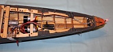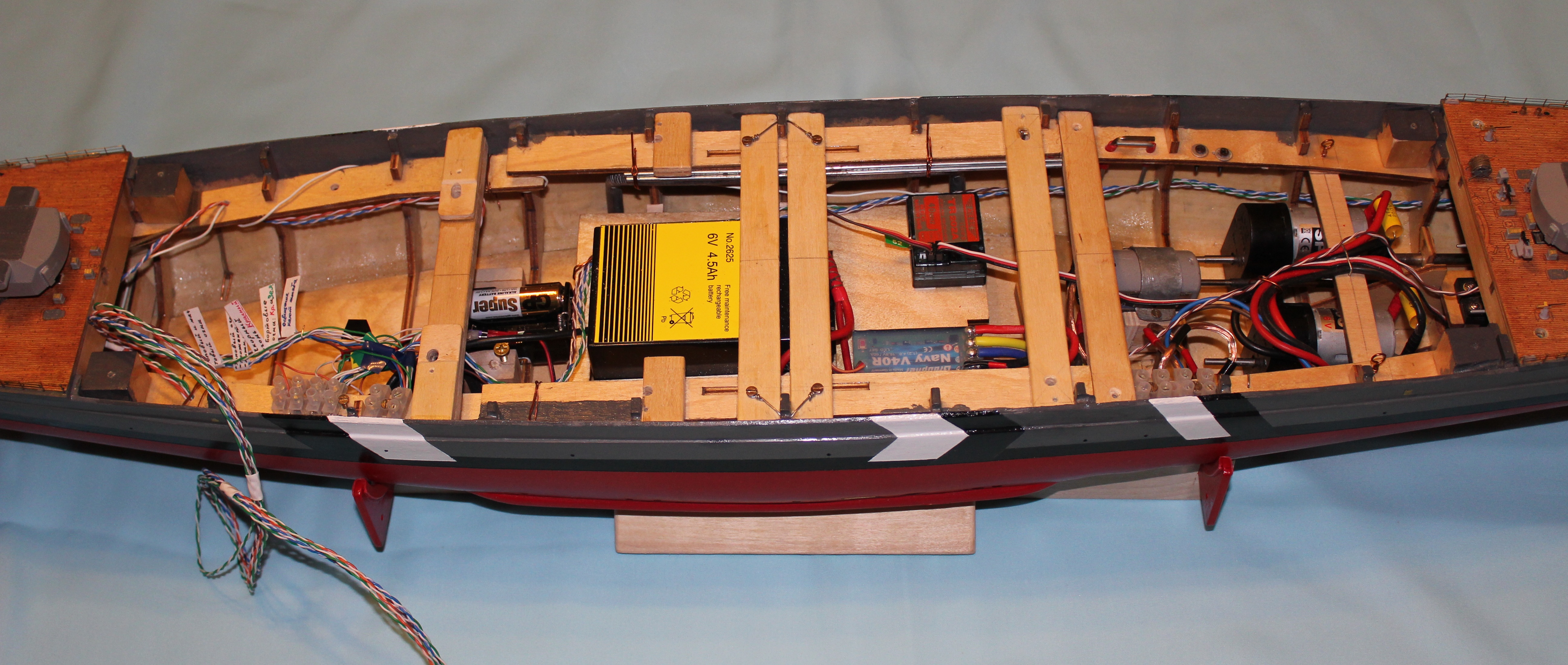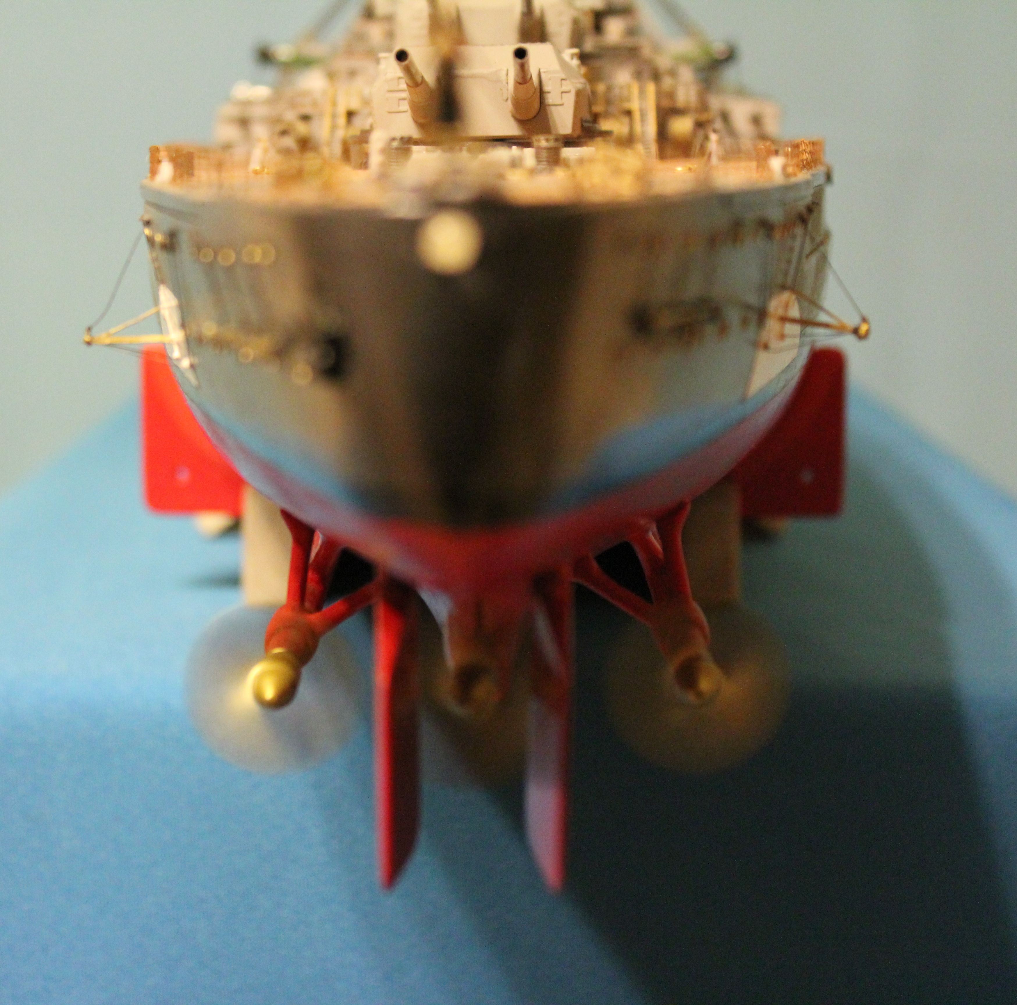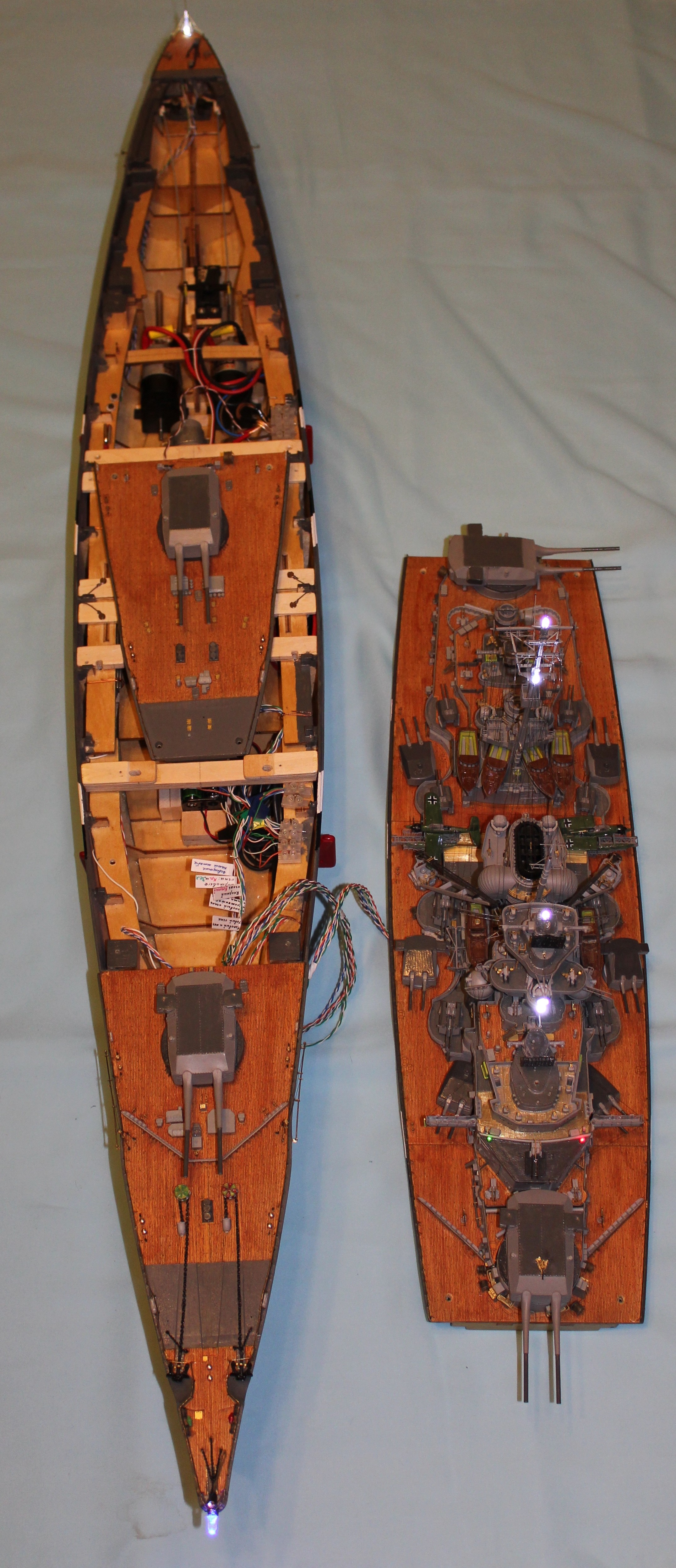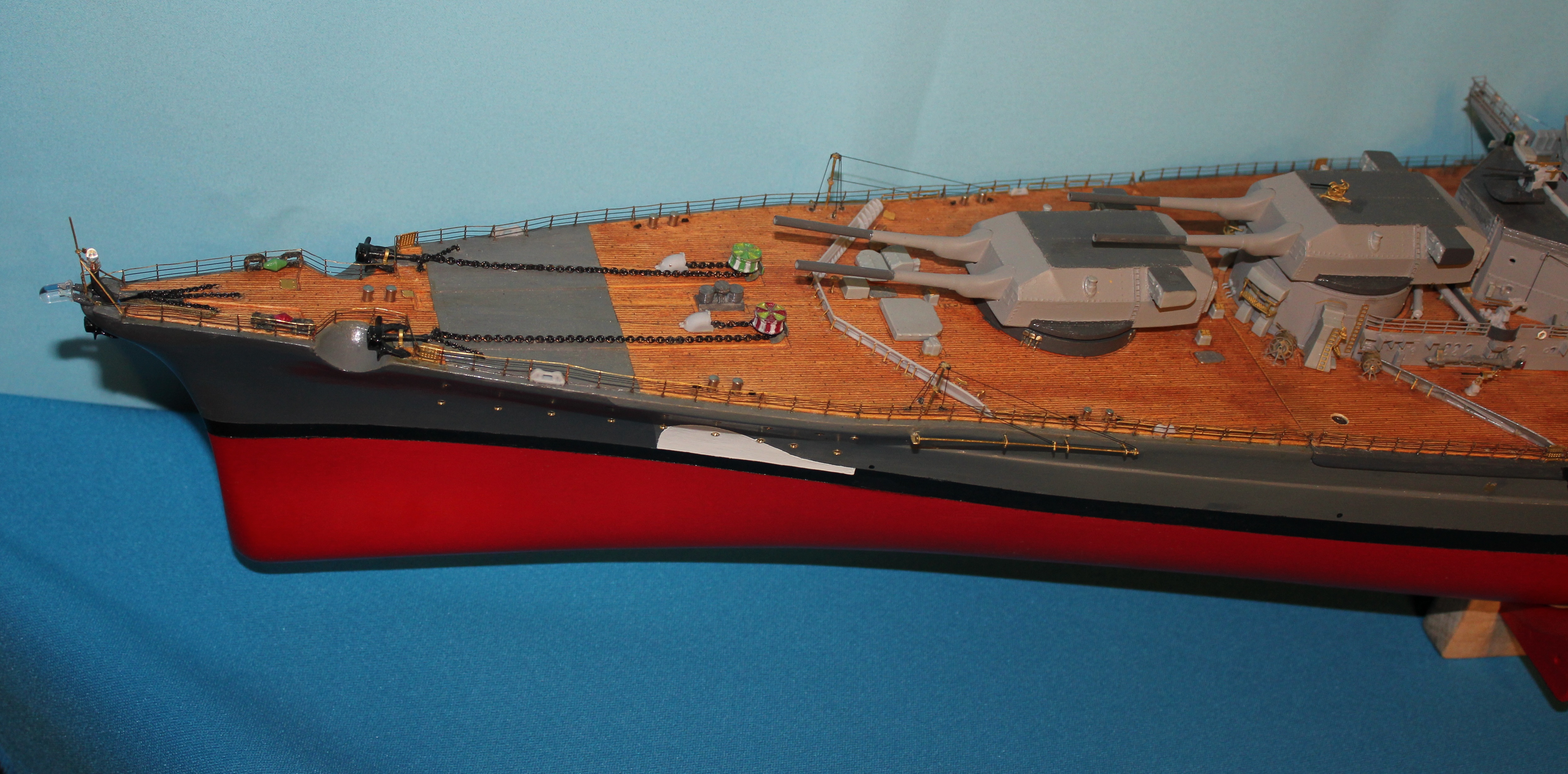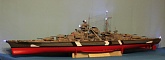 Модель линкора «Бисмарк» собрана из набора «Amati» по российским выпускам журнала от «Hachette». Модель действующая, радиоуправляемая, М 1:200. Длинна модели 1260 мм, ширина - 190 мм, высота 315 мм, вес 4600 грамм. Основные материалы из набора. Дополнительно выполнено: - установлен третий электродвигатель на средний винт; - смонтирована имитация навигационных огней: Бортовые, якорные, топовые, фонарь рулевого, кормовой и кильватерный, освещение в каютах третьего и четвертого ярусов главной надстройки, прожектор №1; с раздельным включением. Всего 15 светодиодов, 2 двухполюсных микровыключателя, питание от трех элементов АА 1.5В. - Верхний релинг выполнен из латунной проволоки вместо лески. - подставка под модель выполнена из ясеня. По уважительным причинам сборка заняла приблизительно три с половиной года. Ранее судомоделизмом не занимался, моя первая модель и это радует!!! А главное то, что ее удалось закончить.