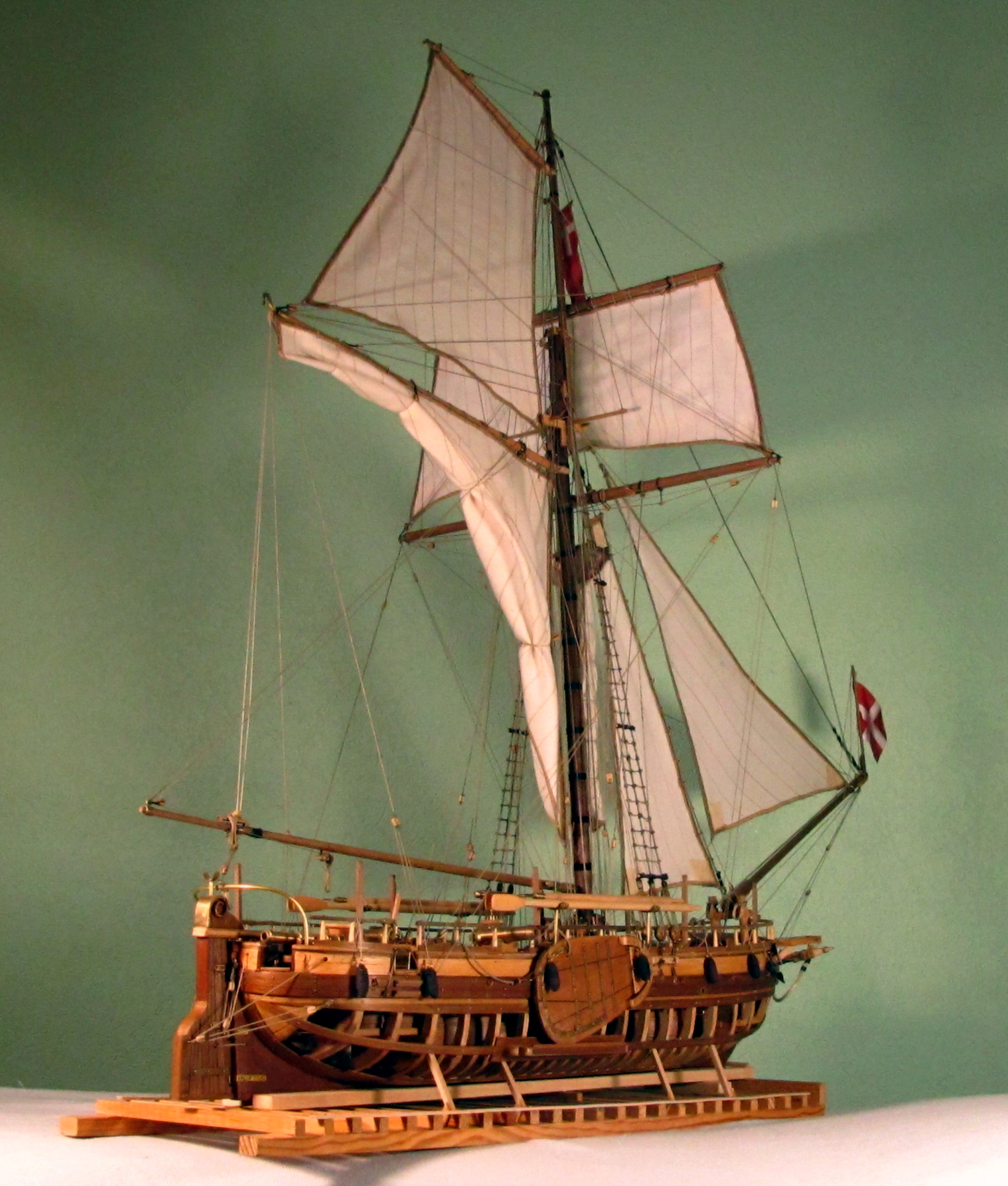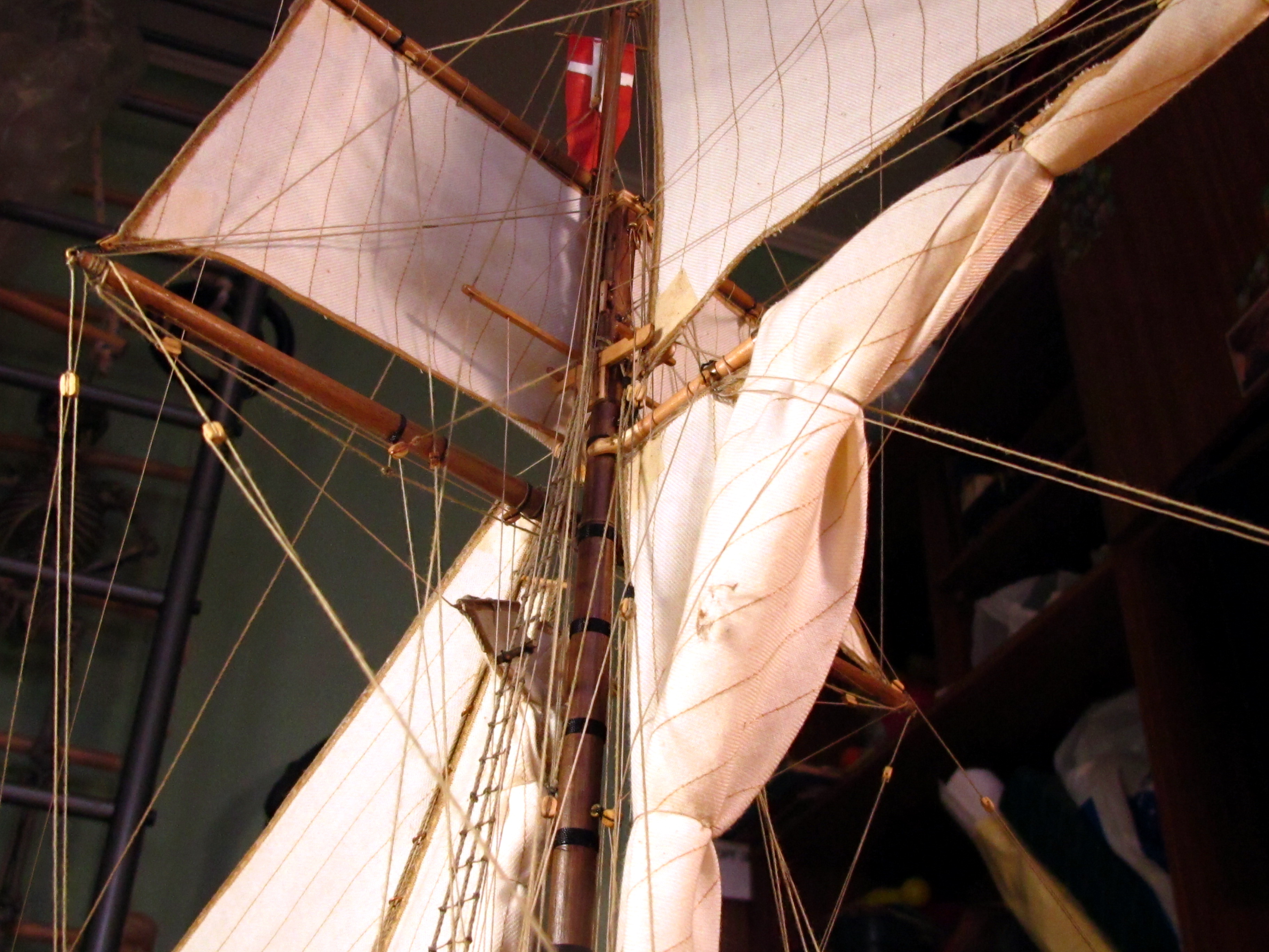 Паруса покупные, из вашего магазина. Немного модернизировал (усилил углы, обшил). При проводке такелажа трудностей не возникло. Чертежи достаточно подробные.