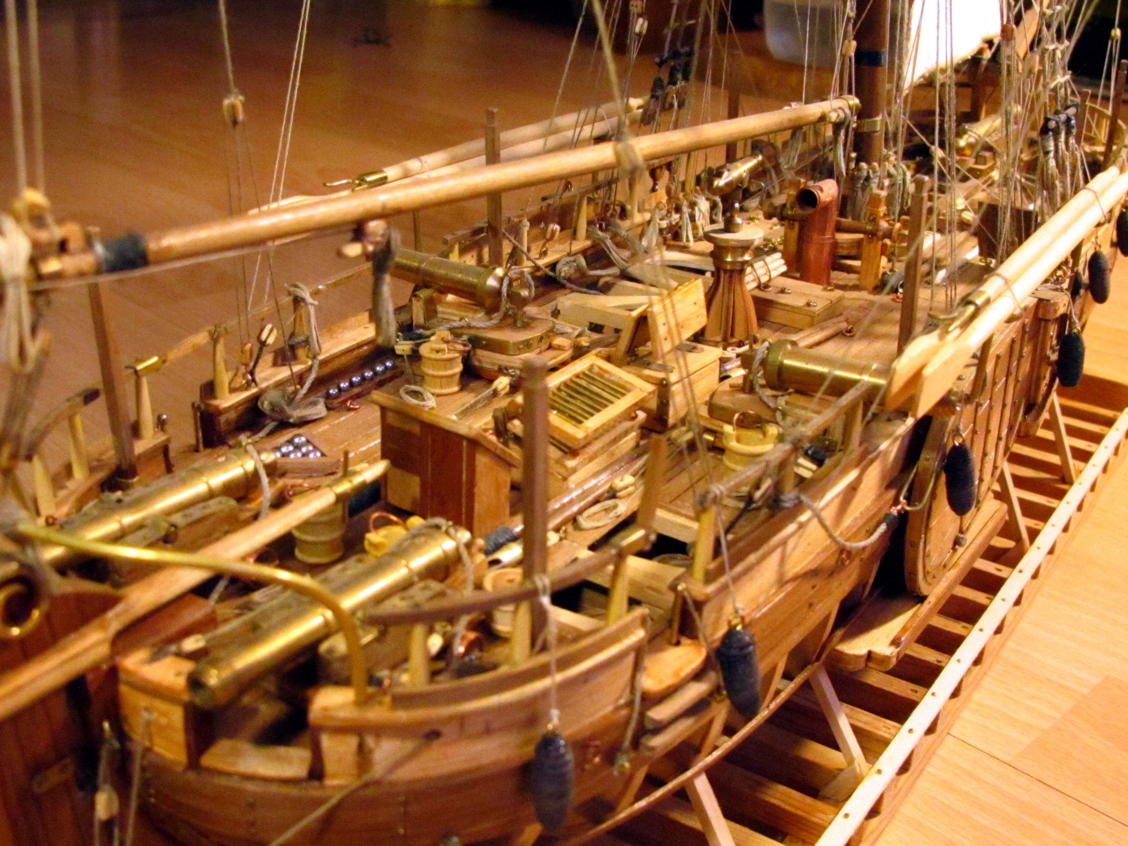 Палуба выполнена со съемными щитами, чтобы видеть "внутренности" (лестницы, перегородки, двери с петлями и ручками, бочки, печки и т.д.).