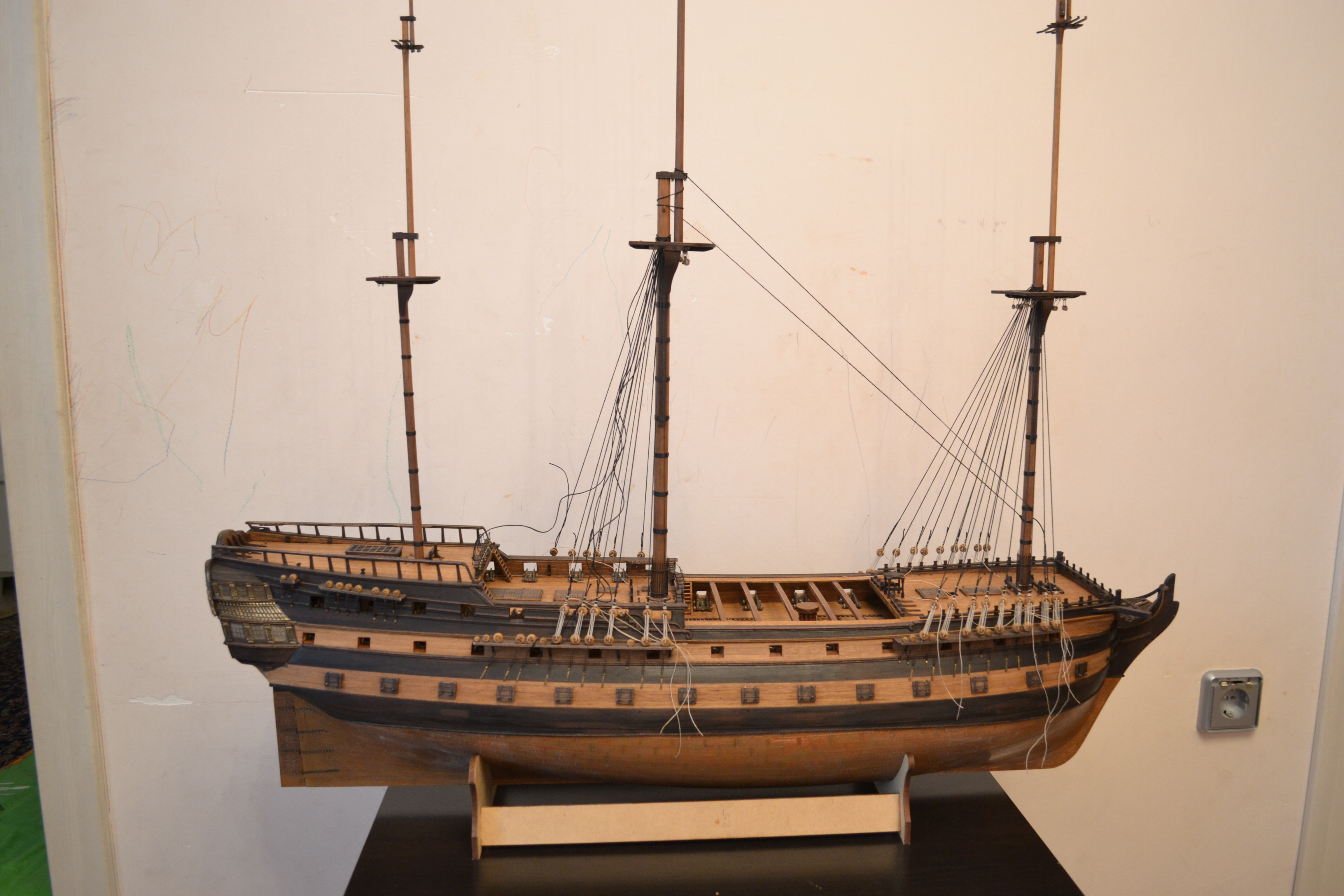 Модель из набора Амати, заменена медная обшивка для новой использовал клейкую ленту из магазина предварительно перфорировал и запатинировал. Черная обшивка из эбена. швы на палубе чернил графитом, готовые детали из набора тонировал морилкой "эбен" модель покрыл маслом тоже из магазина.